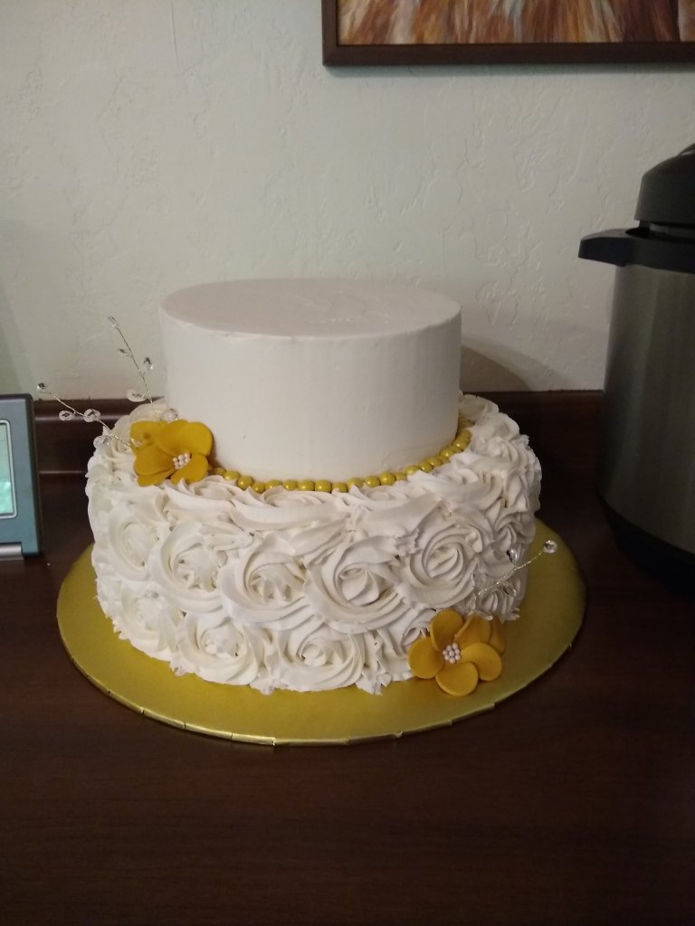 A 12″ and an 8″ vanilla cake iced with vanilla buttercream. The beads are gold sixlets and the flowers are hand made from fondant.
