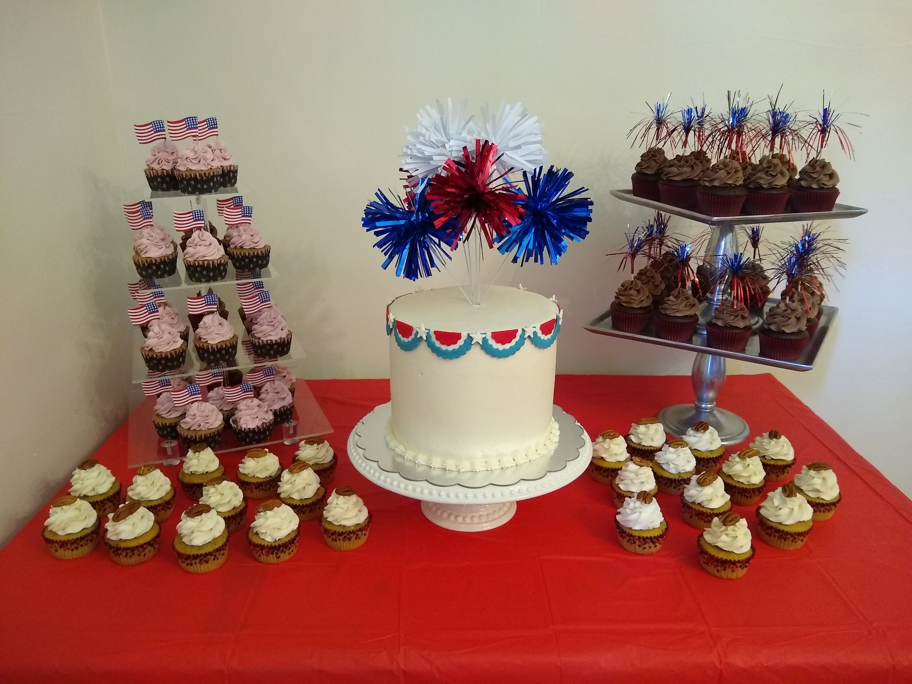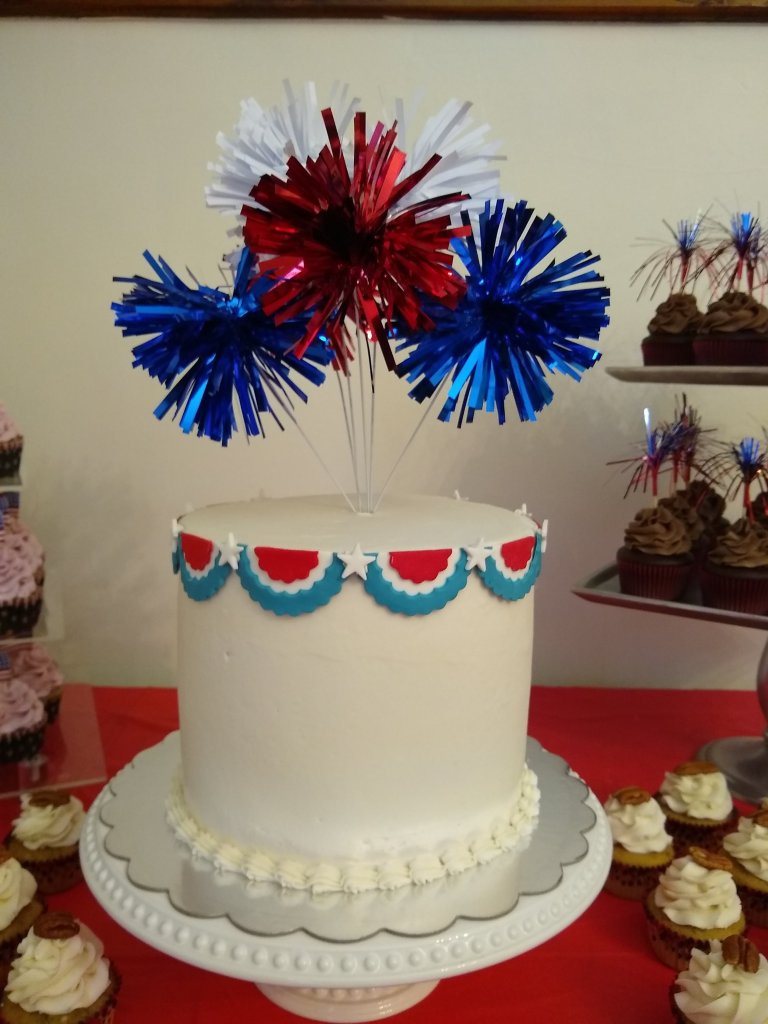 An 8″ double barrel (twice as tall) vanilla cake iced with vanilla buttercream. The bunting is hand made from fondant. 24 chocolate cupcakes, 24 raspberry cupcakes and 24 maple pecan cupcakes.