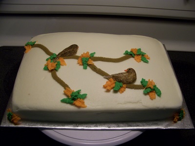 This is a white sheet cake iced with buttercream icing. The birds are made out of fondant. Size: 9″ by 13″.