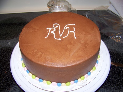 This is a chocolate cake iced with chocolate buttercream icing. This cake was made to match the Baby Butterfly cake. The new babys initials are on the top in a monogram style. Size: 9″