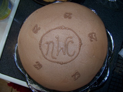 This is a chocolate cake with a peanut butter cookie in the center. It is iced with chocolate buttercream icing. It has the initials of the birthday man on the top as well as his age. Size: 9″