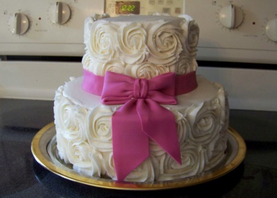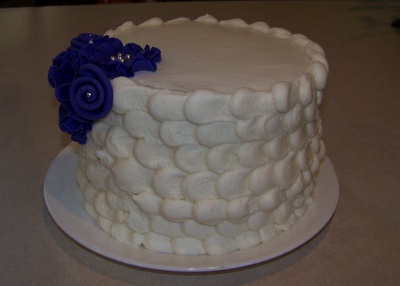 6″ practice cake. Raspberry cake, raspberry filling and white chocolate icing. Dot and drag technique. Flowers are made from fondant.
