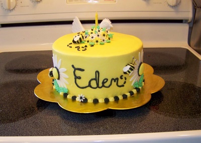 8″ white cake iced with vanilla buttercream icing. Bees and flowers are made from fondant. Made for a first birthday.