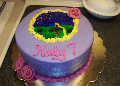 10″ white cake iced with vanilla buttercream. Picture is hand painted onto fondant,it is the scene from Tangled of Rapunzel watching the lanterns.