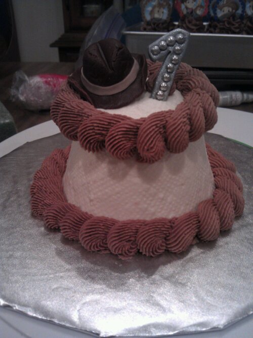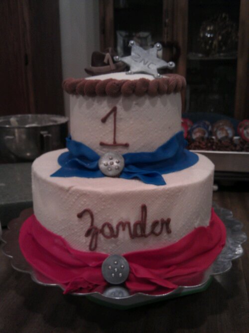10″ white cake iced with vanilla buttercream icing. 6″ white cake iced with vanilla buttercream icing. Bandannaas, buttons, hat and badge are all handmade from fondant.