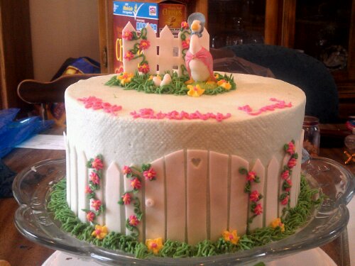 White cake iced with vanilla butter cream. Fence and gate are handmade from fondant. Jemima is a figurine. Chocolate cupcakes made to match and a white cupcake for a smash cake.