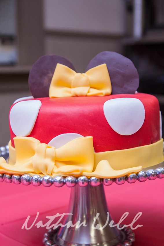 White cake with vanilla buttercream icing and covered with red fondant. Ears are made out of chocolate. Bows and dots are made out of fondant.