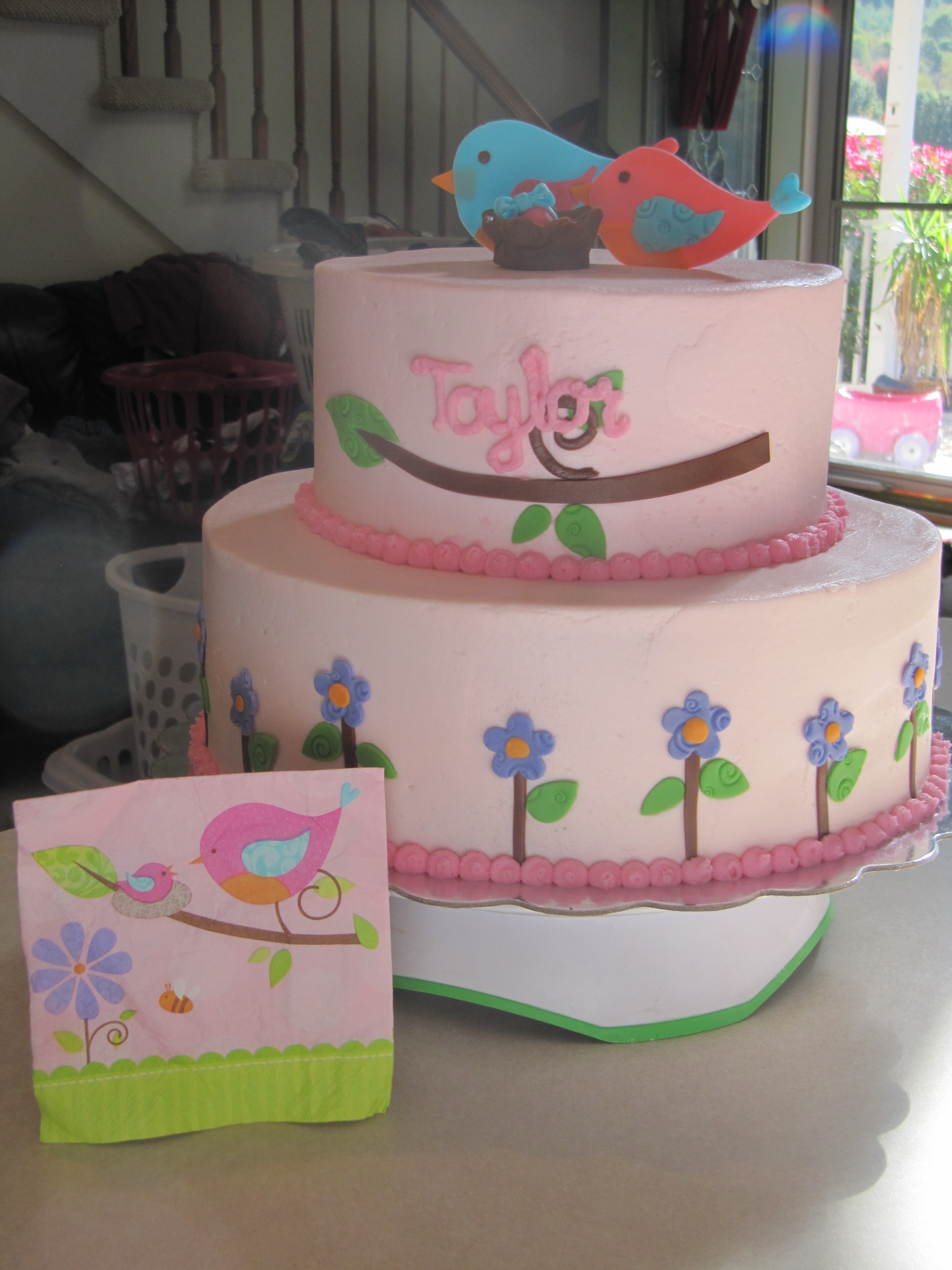 White and strawberry cake with vanilla buttercream icing. Birds, flowers, branches, leaves and bows are made from fondant. It is made to match the babyshower decor.