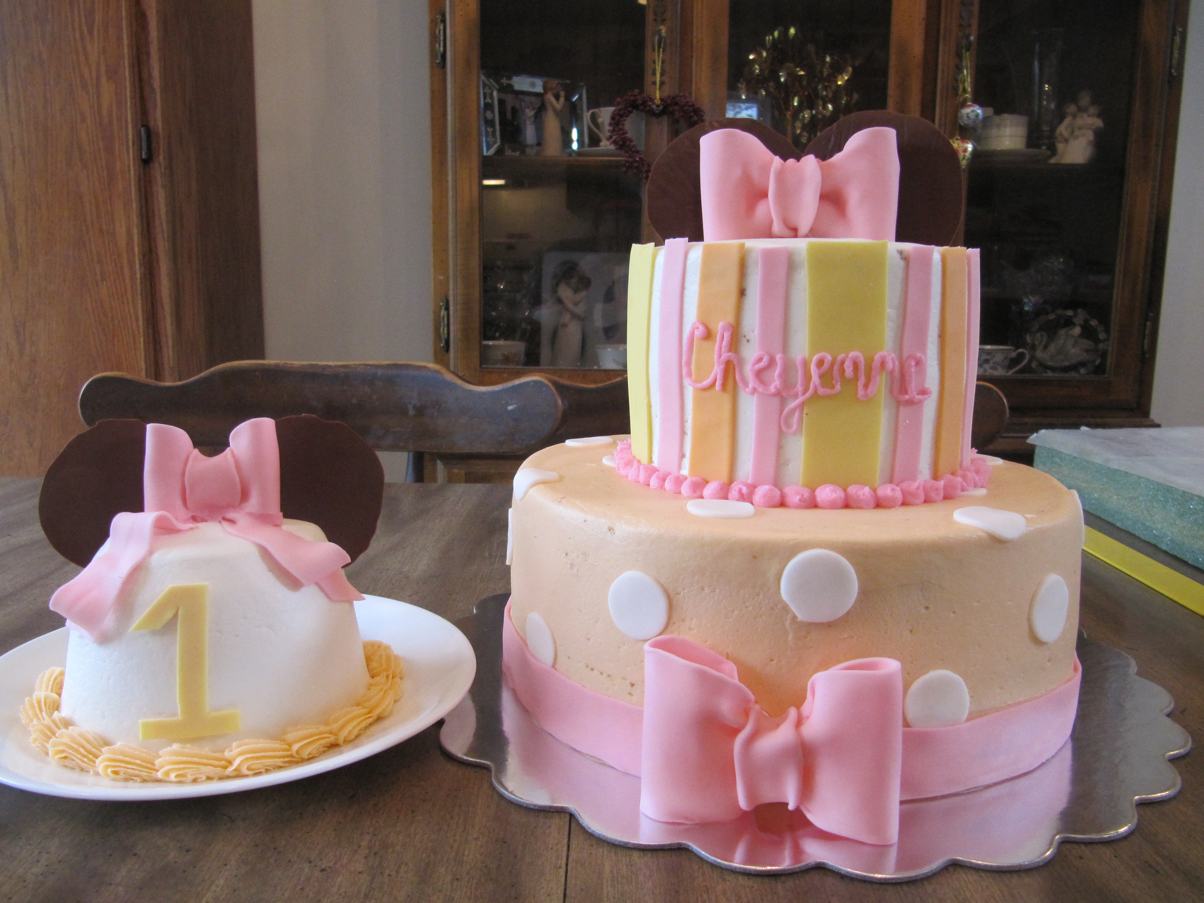 White cake with vanilla buttercream icing. Ears are made out of chocolate and bows, stripes and dots are made out of fondant. They are made to match the party decor!