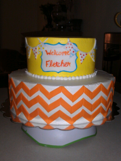 A 12″ and 8″ white cake iced with vanilla buttercream icing. The banner, plaque and chevrons are all handmade from fondant!