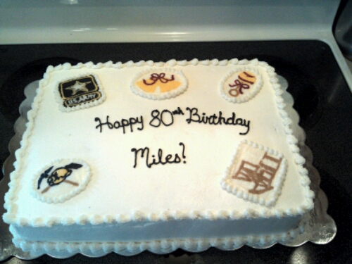 A life events birthday cake. The gentleman is turning 80, was in the army, got married, had children, was a coalminer and is now retired. This is a half white sheet cake iced with vanilla buttercream icing. All decorations are frozen buttercream transfers.