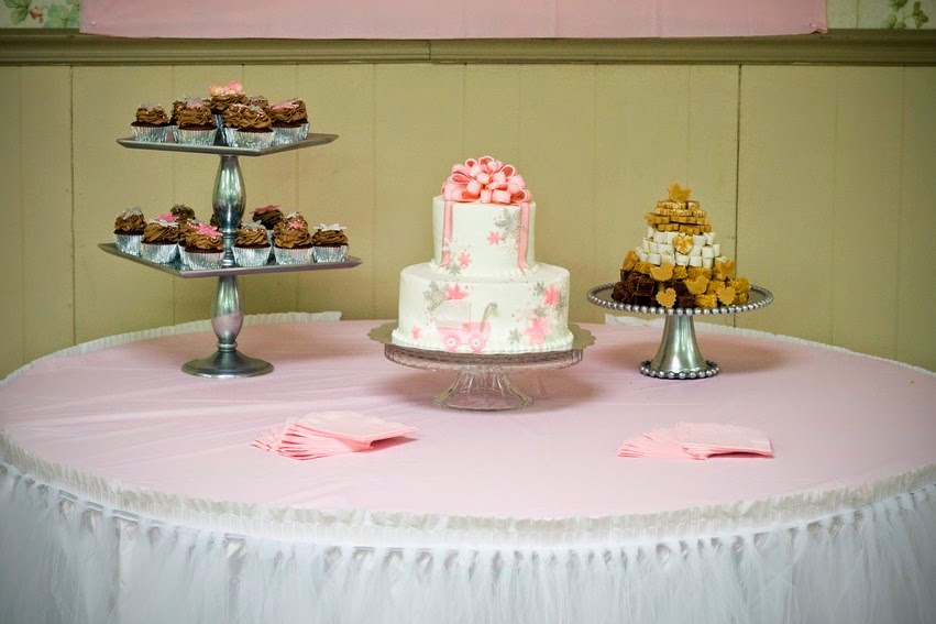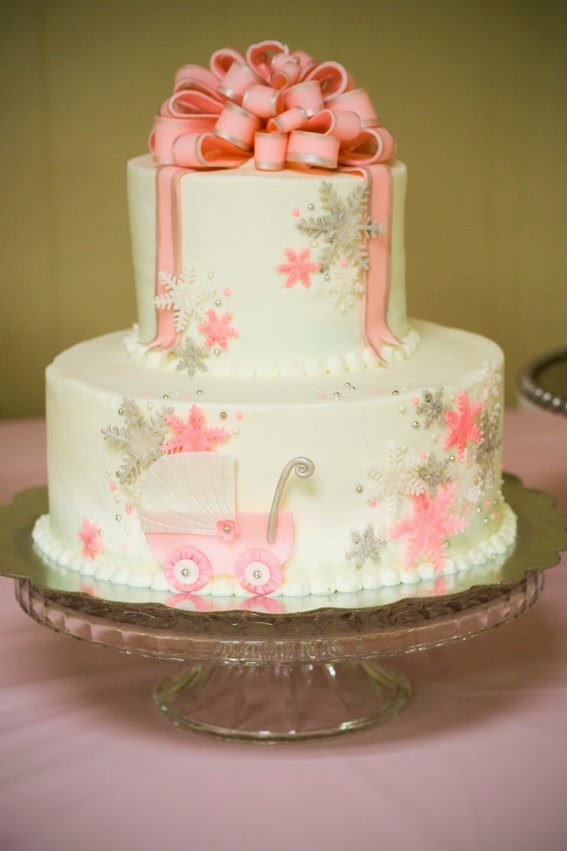 Winter themed baby shower cake and cupcakes. 10″ and 6″ white cake iced with vanilla buttercream icing. 24 chocolate cupcakes iced with chocolate buttercream icing. All decorations are hand made from fondant.