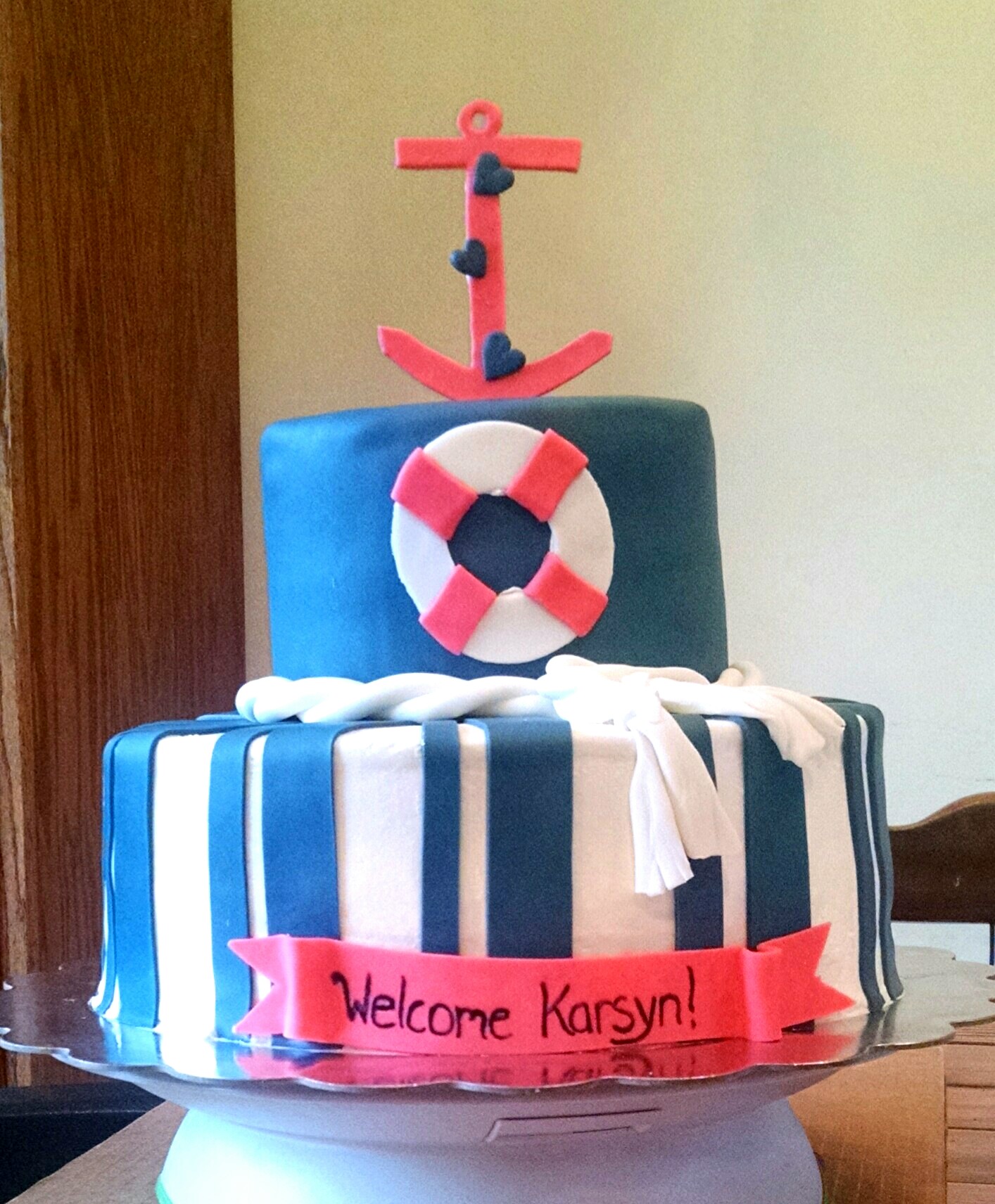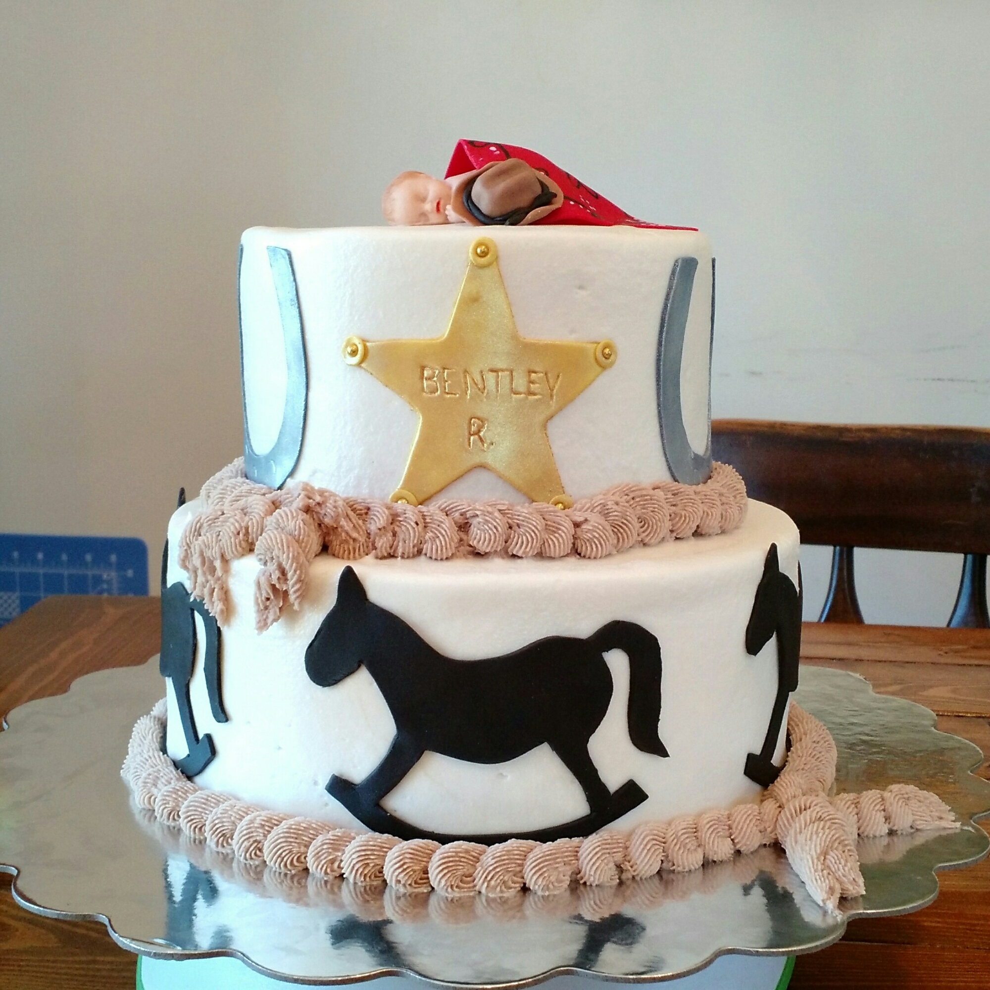 A 6″ and 8″ vanilla cake iced in vanilla buttercream. All decorations are handmade from fondant. Sheriff’s badge has the baby’s name on it. Chocolate cupcakes are iced with chocolate buttercream icing.
