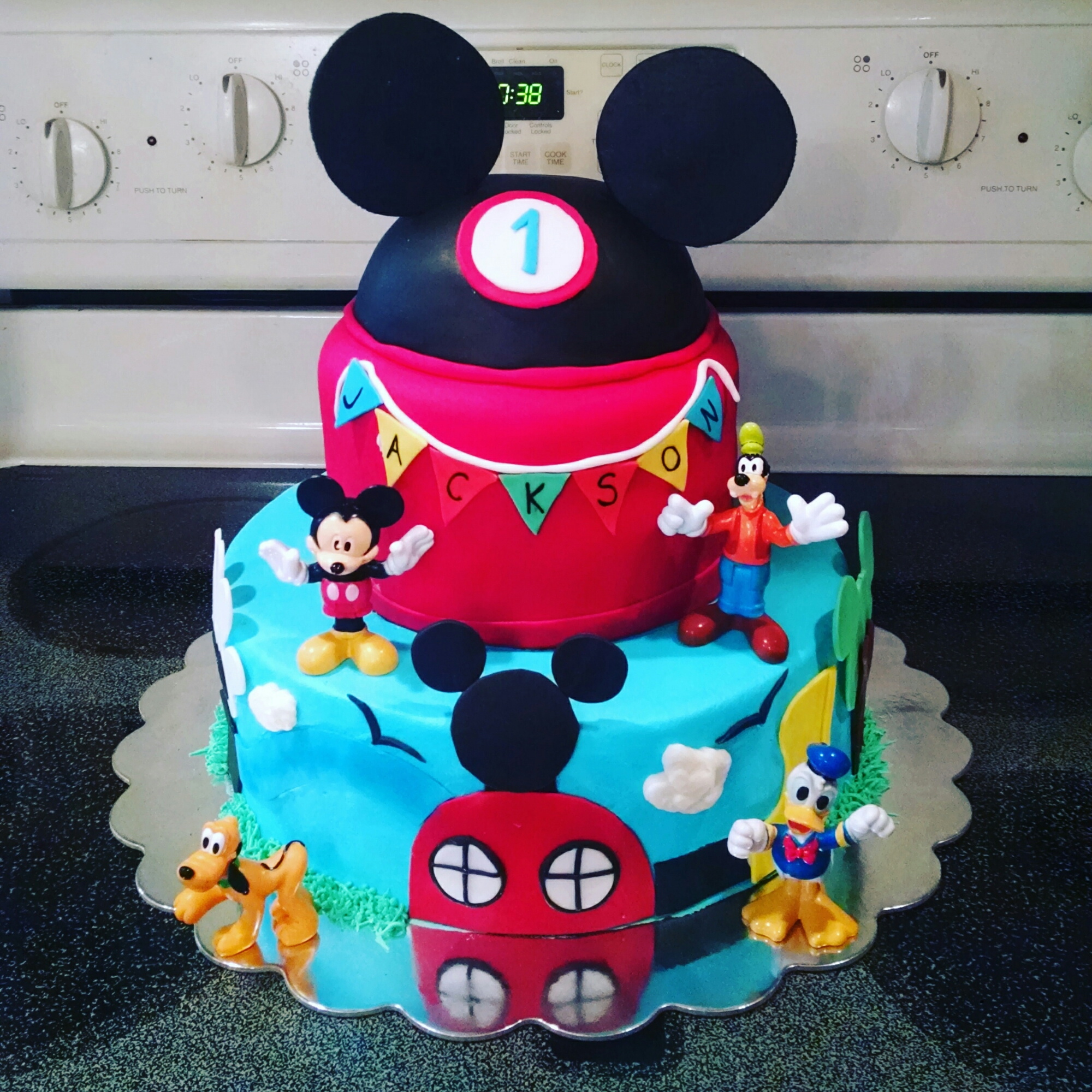 A 10″ and 6″ vanilla cake iced with vanilla buttercream icing. The top layer is also covered with blue fondant. All decorations are handmade from fondant.