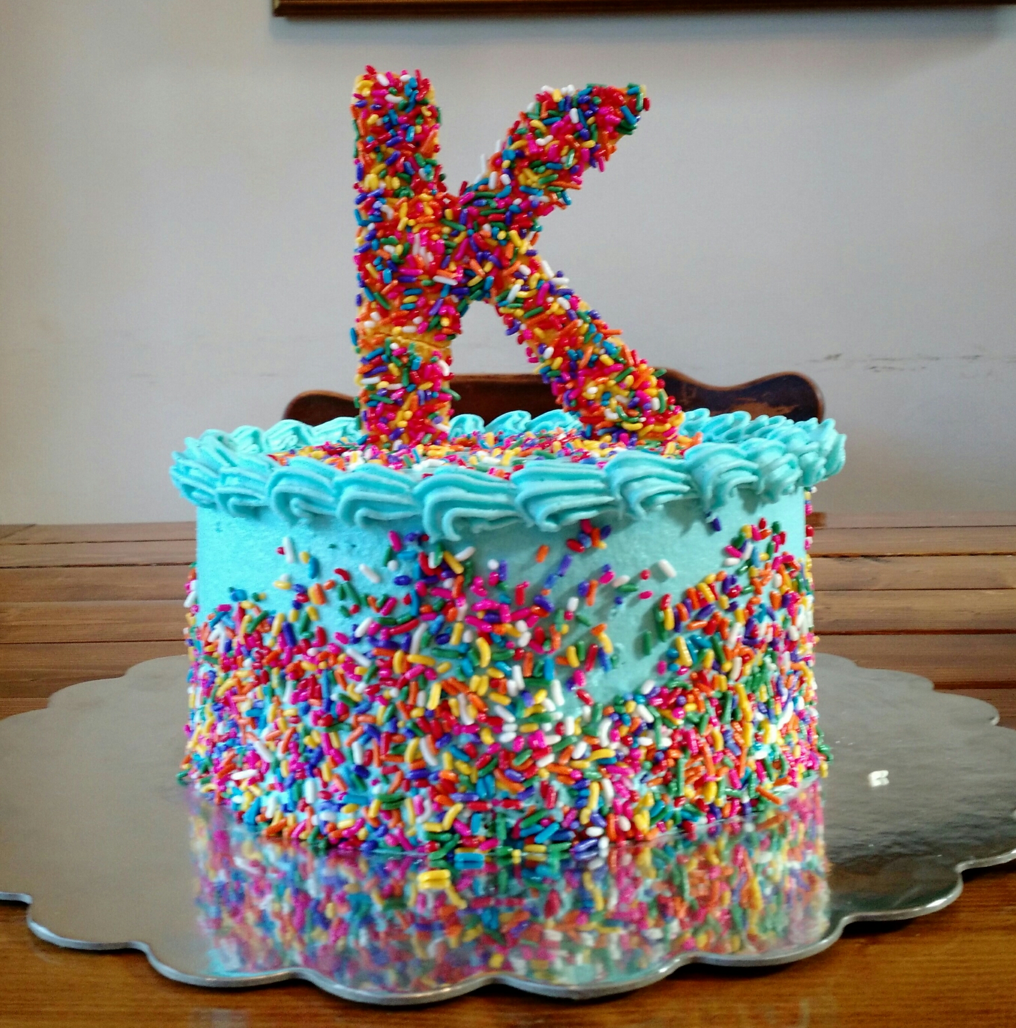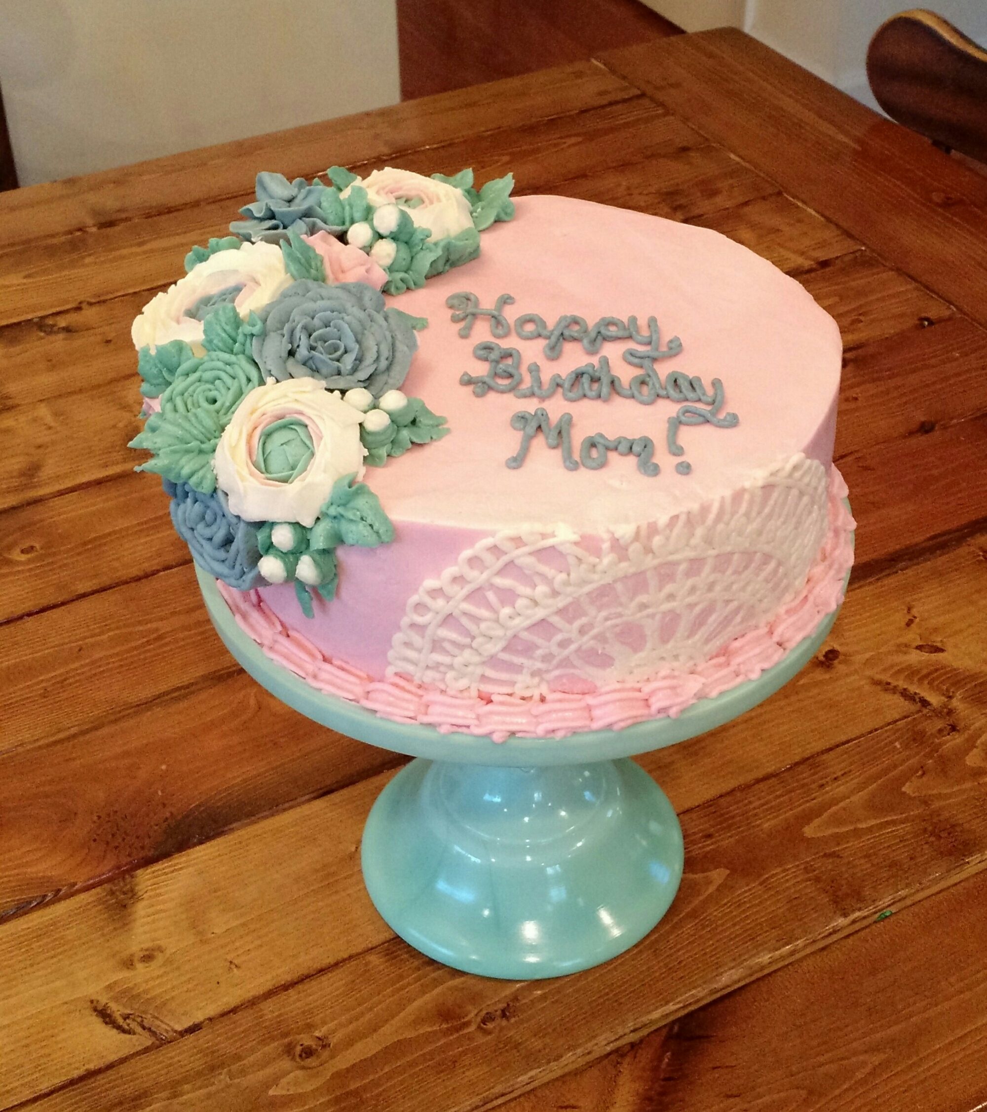 A chocolate cake iced with peanut butter buttercream. All decorations are buttercream. This cake was done on a plain cake board because it is a cake for our household.