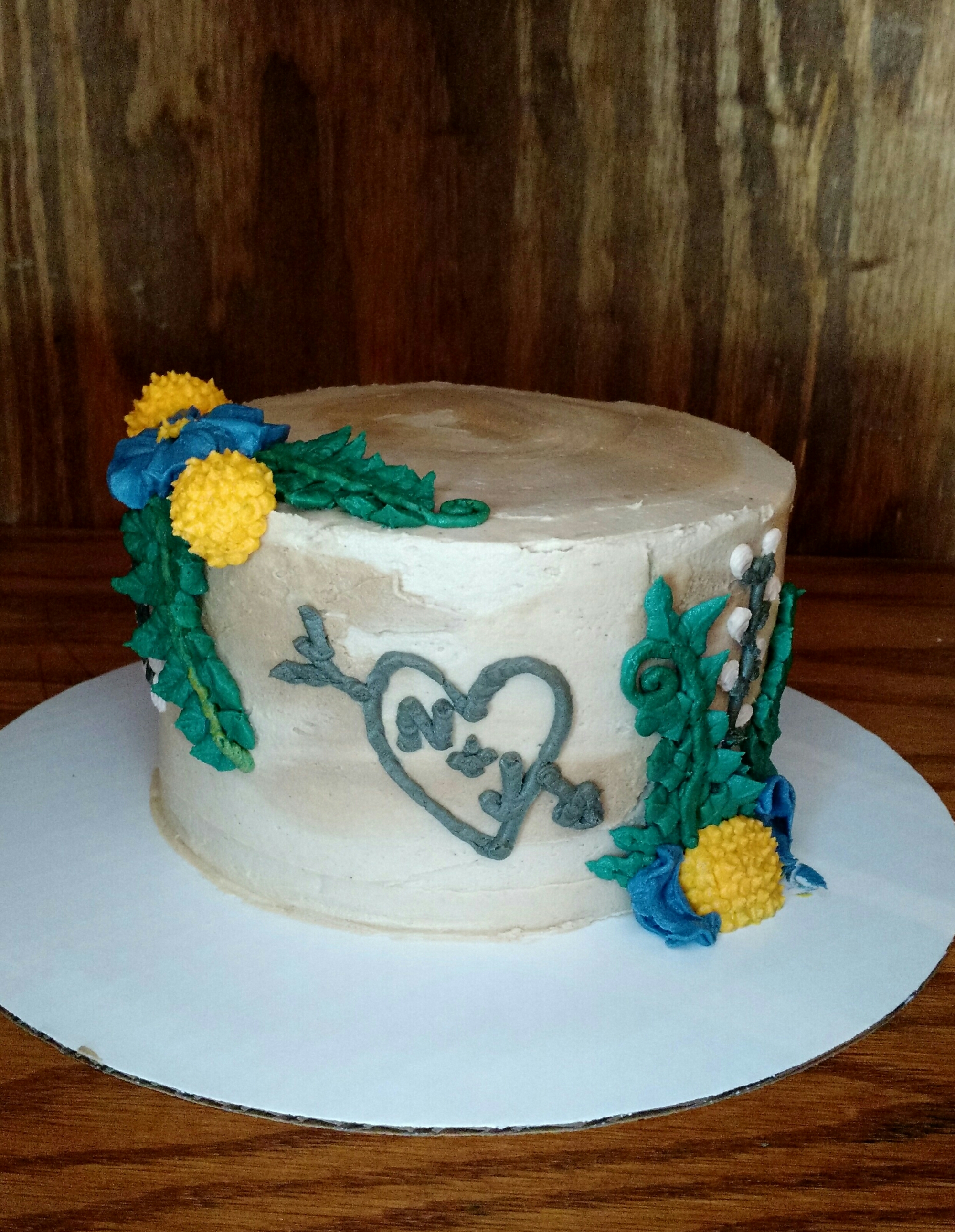 Created to look like a stump with initials and a heart carved into it. Ferns, pussy willows, Billy buttons and blue flowers adorn the side and top.