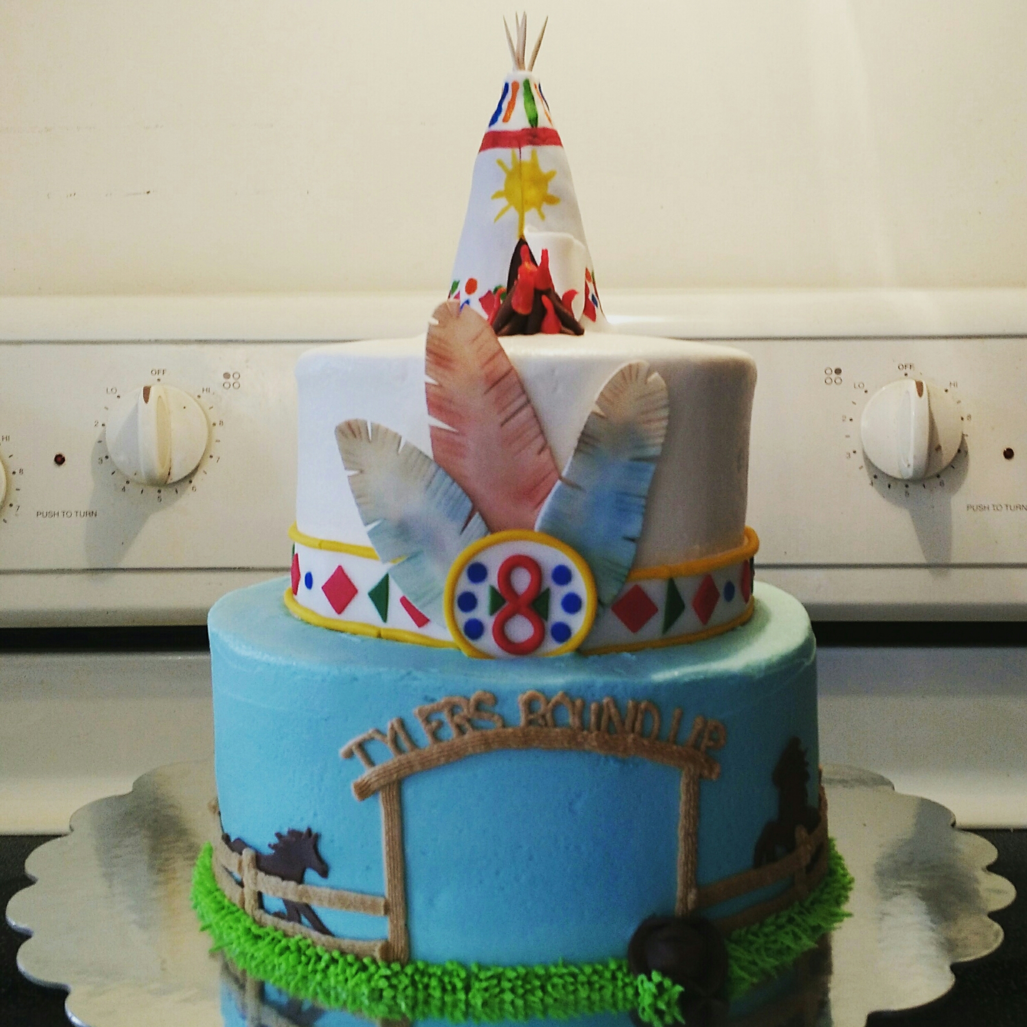 An 8″ and 6″ chocolate cake filled with marshmallow cream filling and iced with vanilla buttercream. All decorations are handmade from fondant.