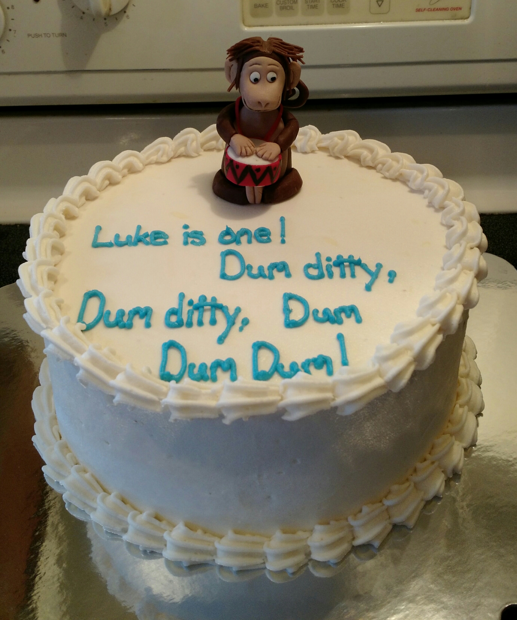 An 8″ vanilla cake iced with vanilla buttercream. The monkey and drum are handmade from fondant and modeling chocolate. This cake was inspired by the Dr. Suess book “Hand Hand Fingers Thumb”.