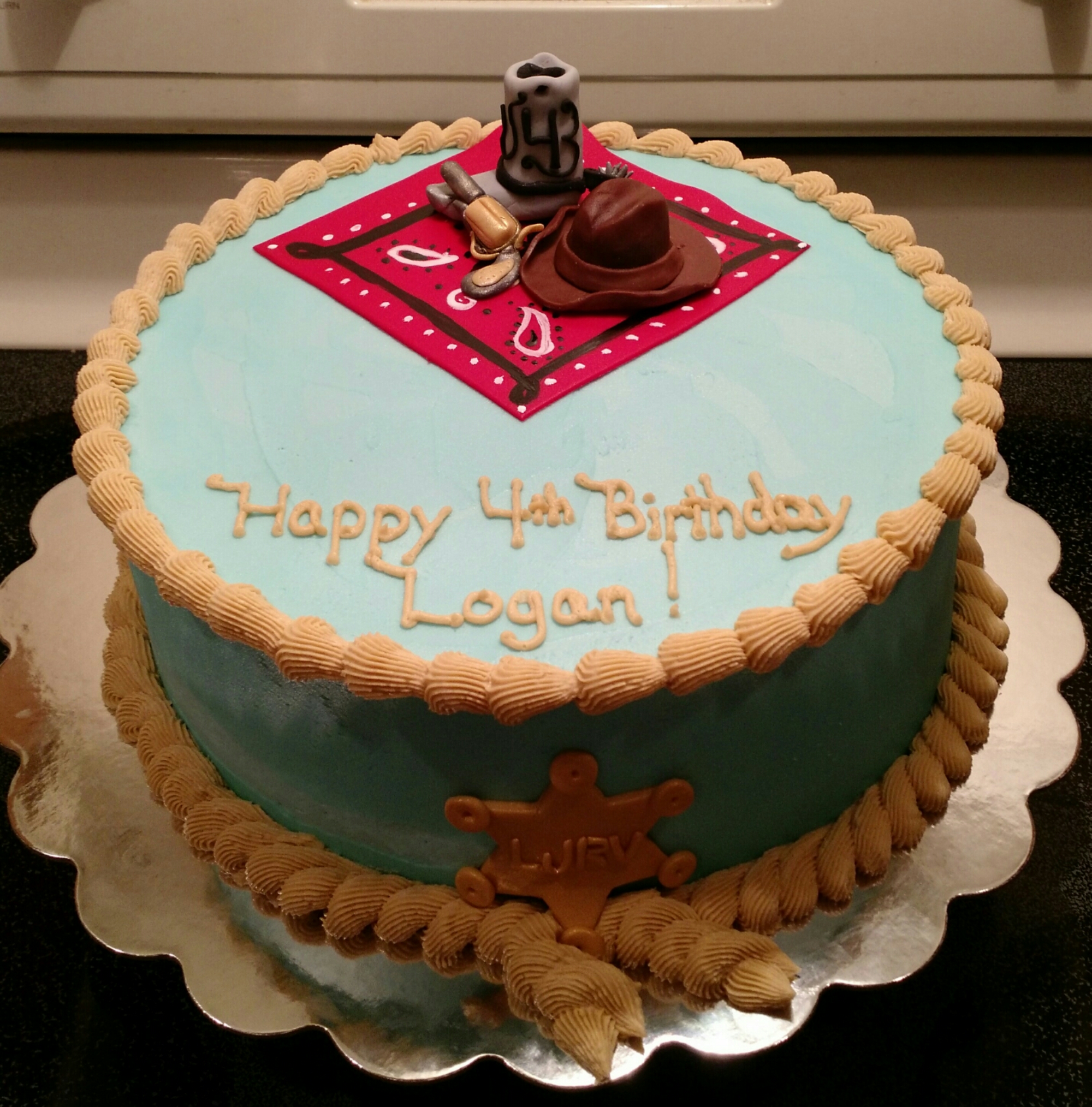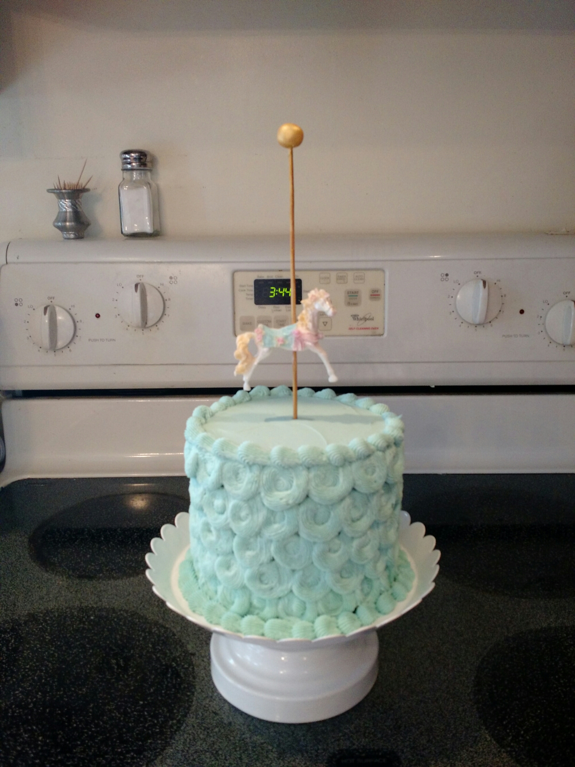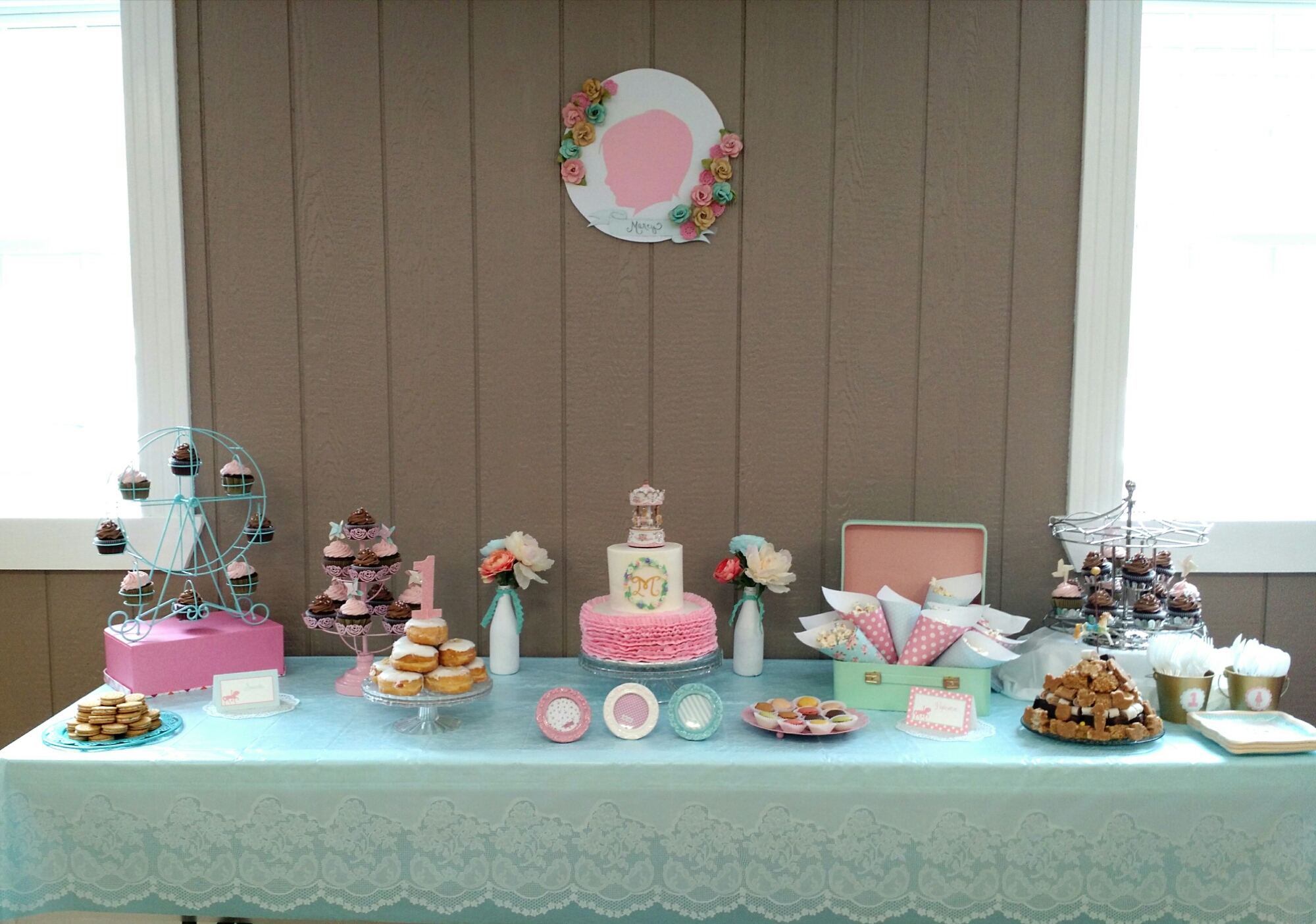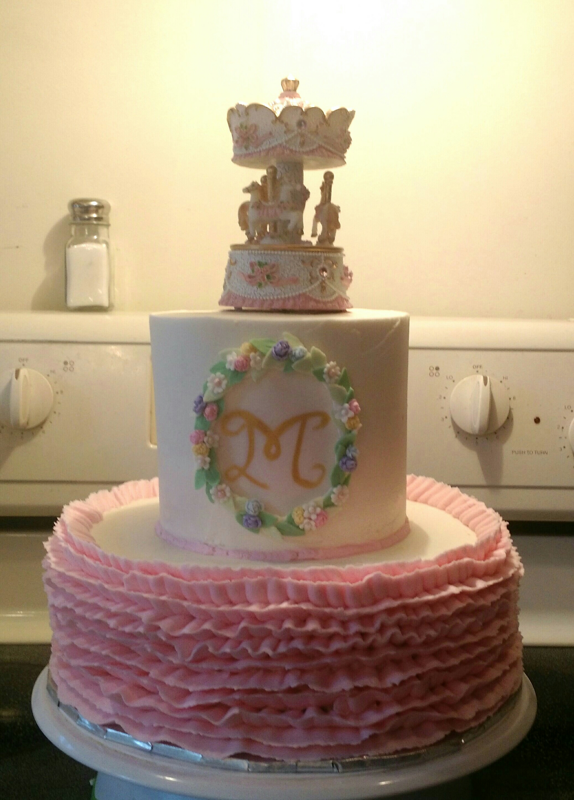 A 6″ and 10 vanilla cake iced with vanilla buttercream. The monogram plaque is handmade from fondant. A vanilla smash cake iced with vanilla buttercream. The horse is made from fondant. The cake, smash cake and chocolate cupcakes were provided by Cake Place.