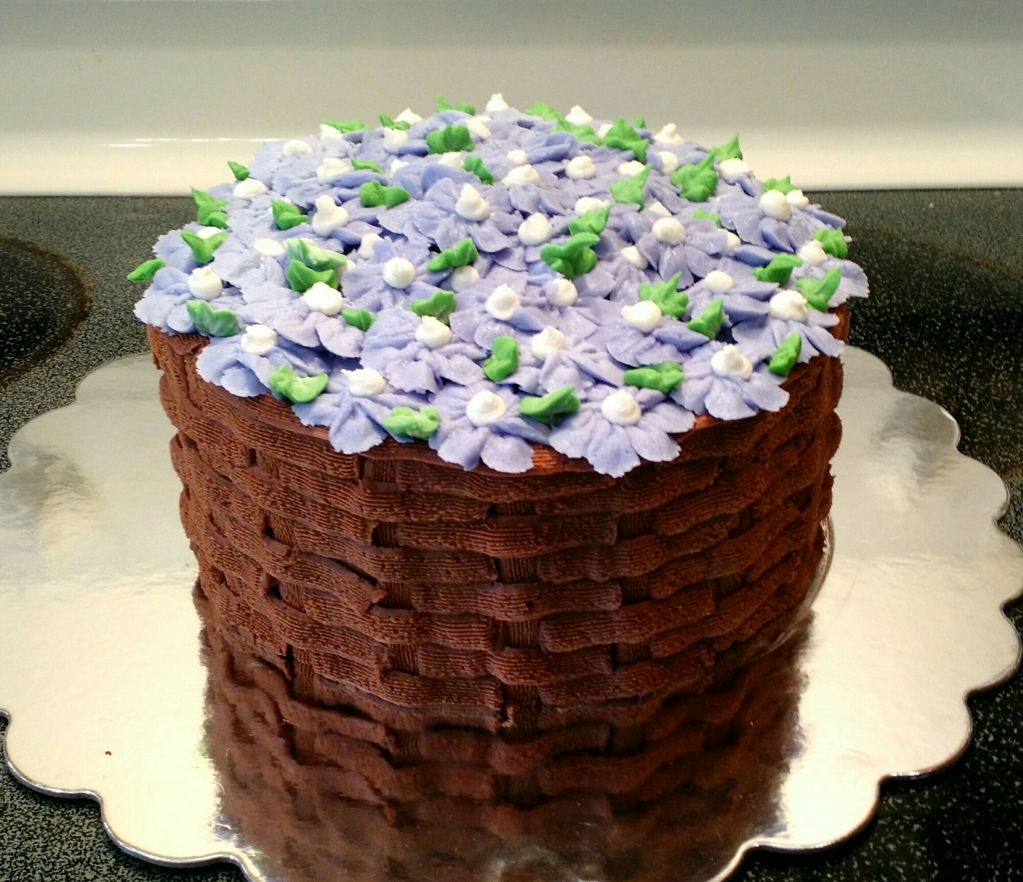 decorations are buttercream. It is intended to look like a basket full of purple flowers!