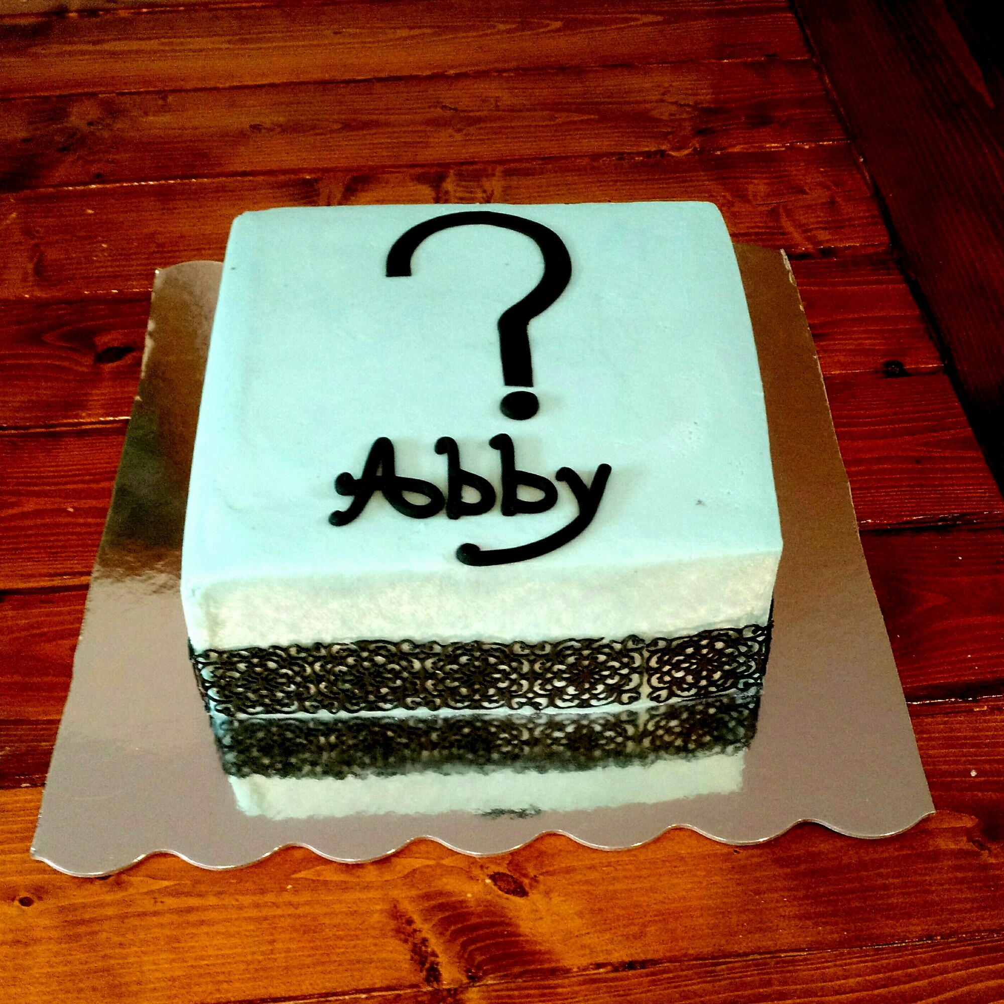 An 8″ square vanilla cake with vanilla buttercream icing. Lace, name and question mark are all handmade from fondant.