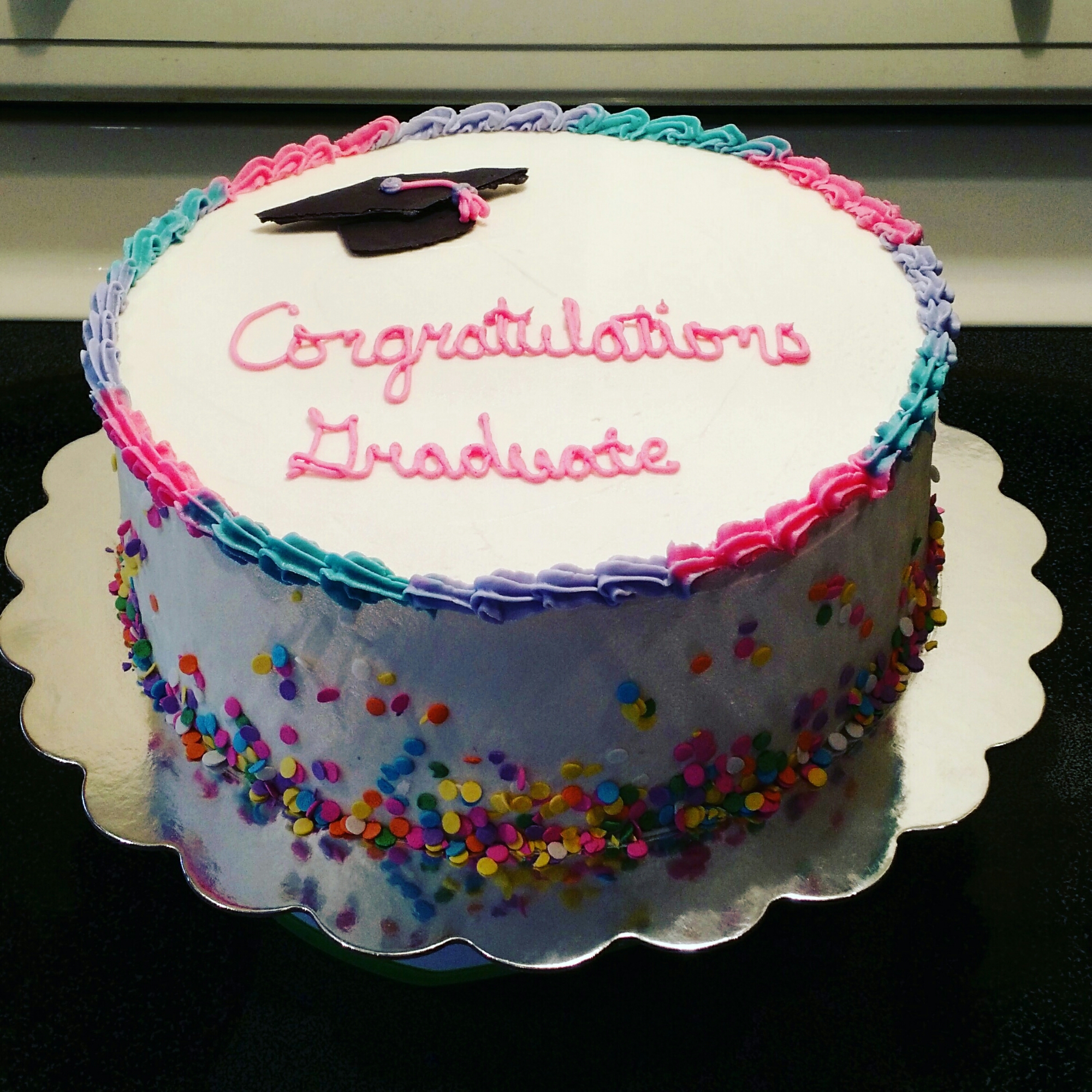 A 10″ vanilla cake iced with vanilla buttercream. Confetti sprinkles around the bottom border and the mortarboard is made out of chocolate.