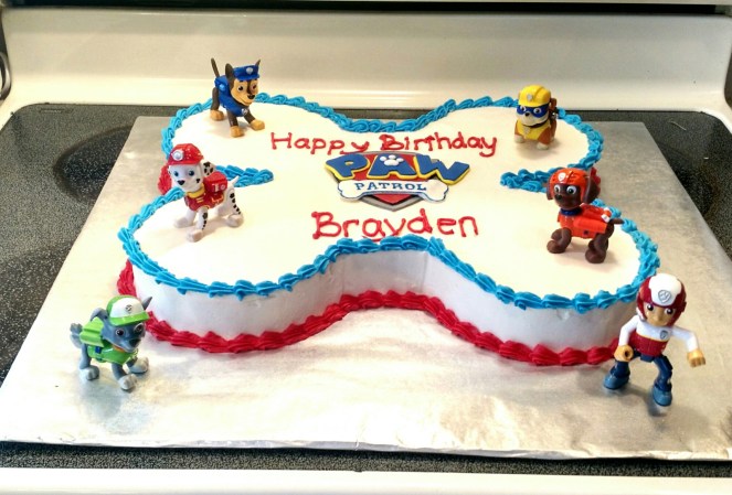A vanilla sculpted cake iced with vanilla buttercream. The logo is handmade from fondant and the figurines are toys.