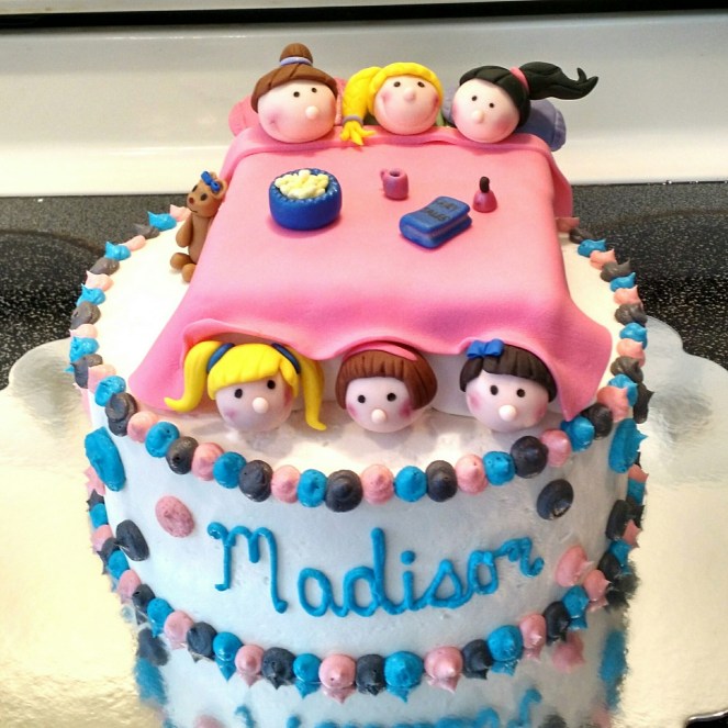 An 8″ vanilla cake iced with vanilla buttercream. The bed structure is made out of rice krispies and all other decorations are handmade from fondant.