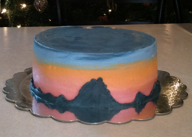 An 8″ cake iced with vanilla buttercream. All decorations are buttercream. It is a sunset behind House and Barn mountain in Virginia.