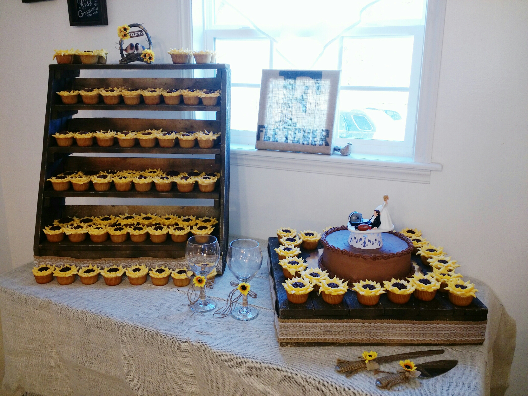 A 10″ chocolate cake iced with chocolate buttercream and 100 vanilla cupcakes iced with vanilla buttercream to look like sunflowers!