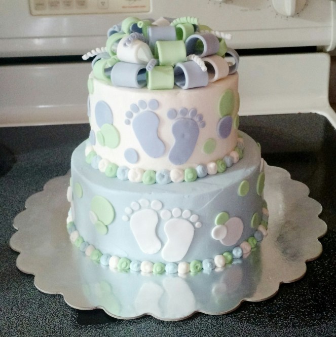 A 6″chocolate cake iced with vanilla buttercream, an 8″ vanilla cake iced with vanilla buttercream. All decorations are handmade from fondant.