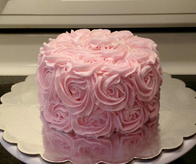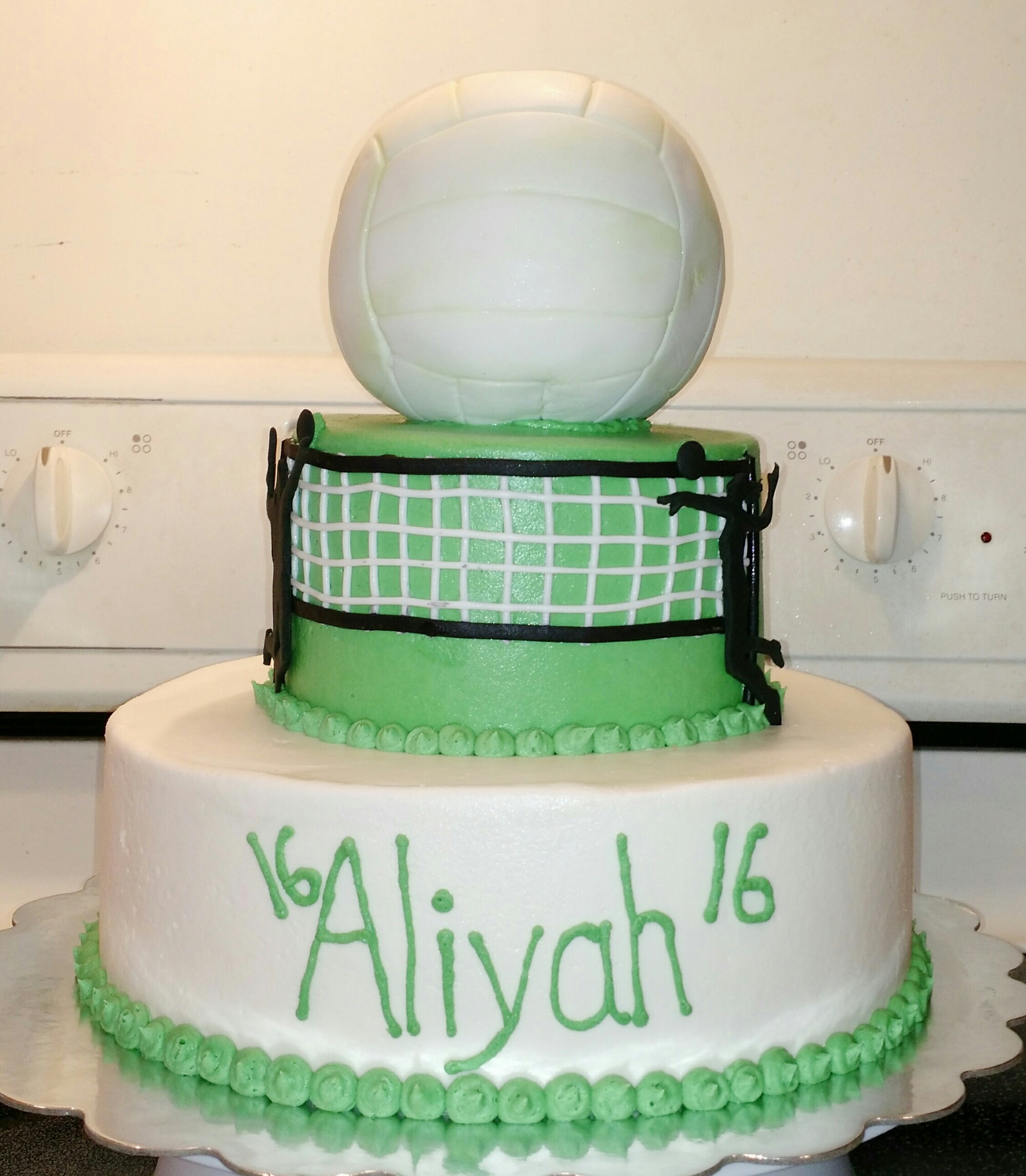 A 10″ and 6″ vanilla cake iced with vanilla buttercream. The people, and net are handmade from fondant. The volleyball is a rice krispie treat covered in fondant.