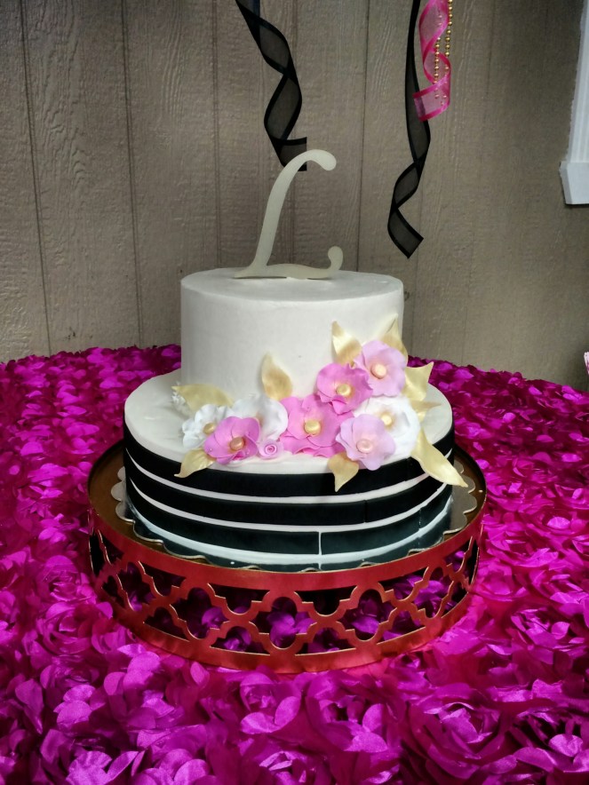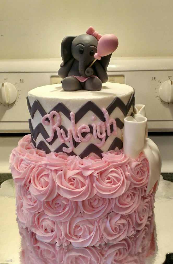 An 8″ vanilla cake and a 6″ chocolate cake iced with vanilla buttercream. The chevrons, bow, elephant and balloon are all handmade from fondant. A 6″ vanilla smash cake was made to match.