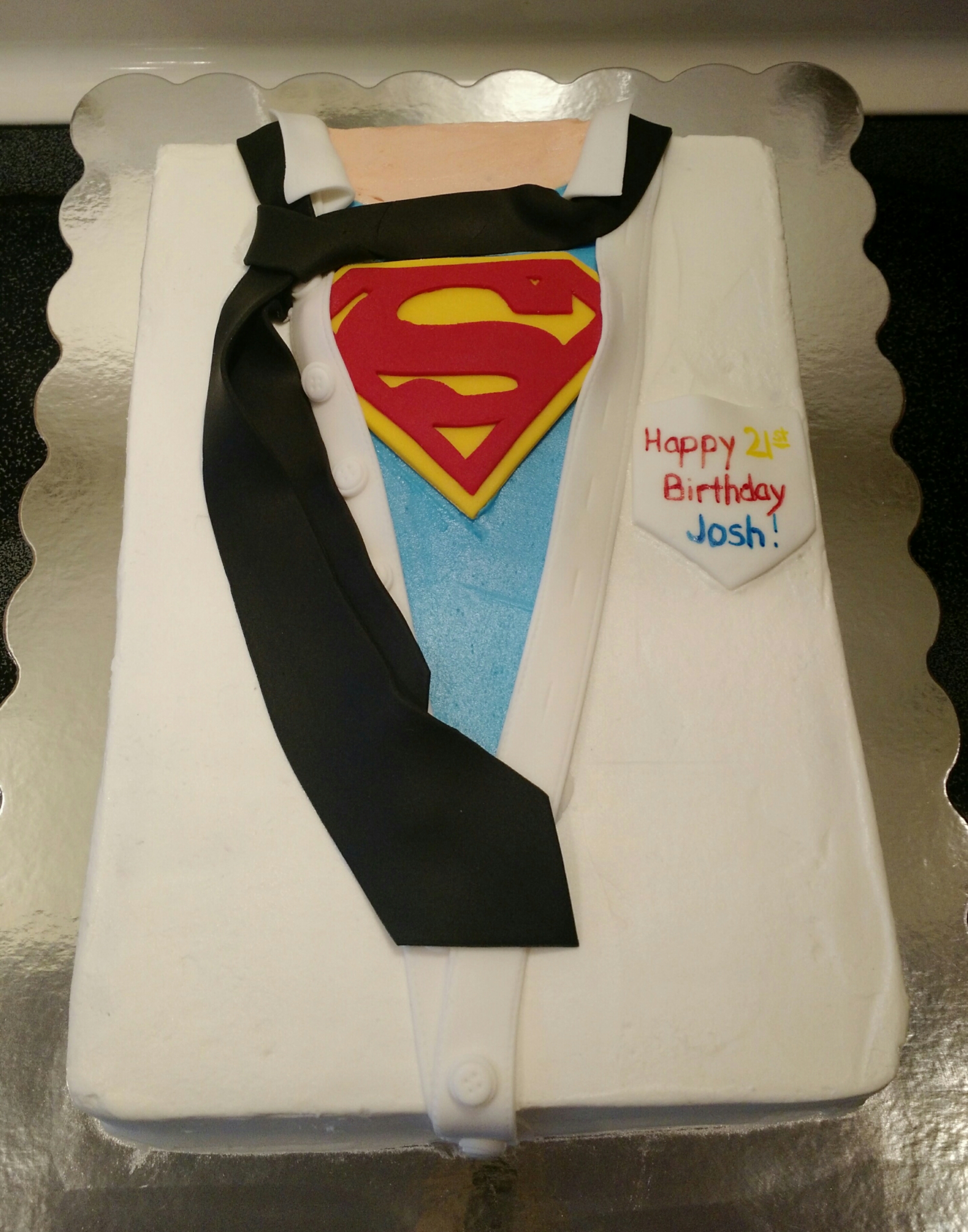 A 9*13 peanut butter cake iced with vanilla buttercream. All decorations (collar, pocket, emblem, buttons and tie) are handmade from fondant.