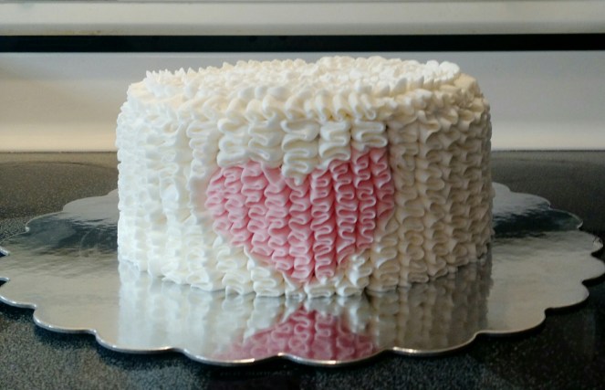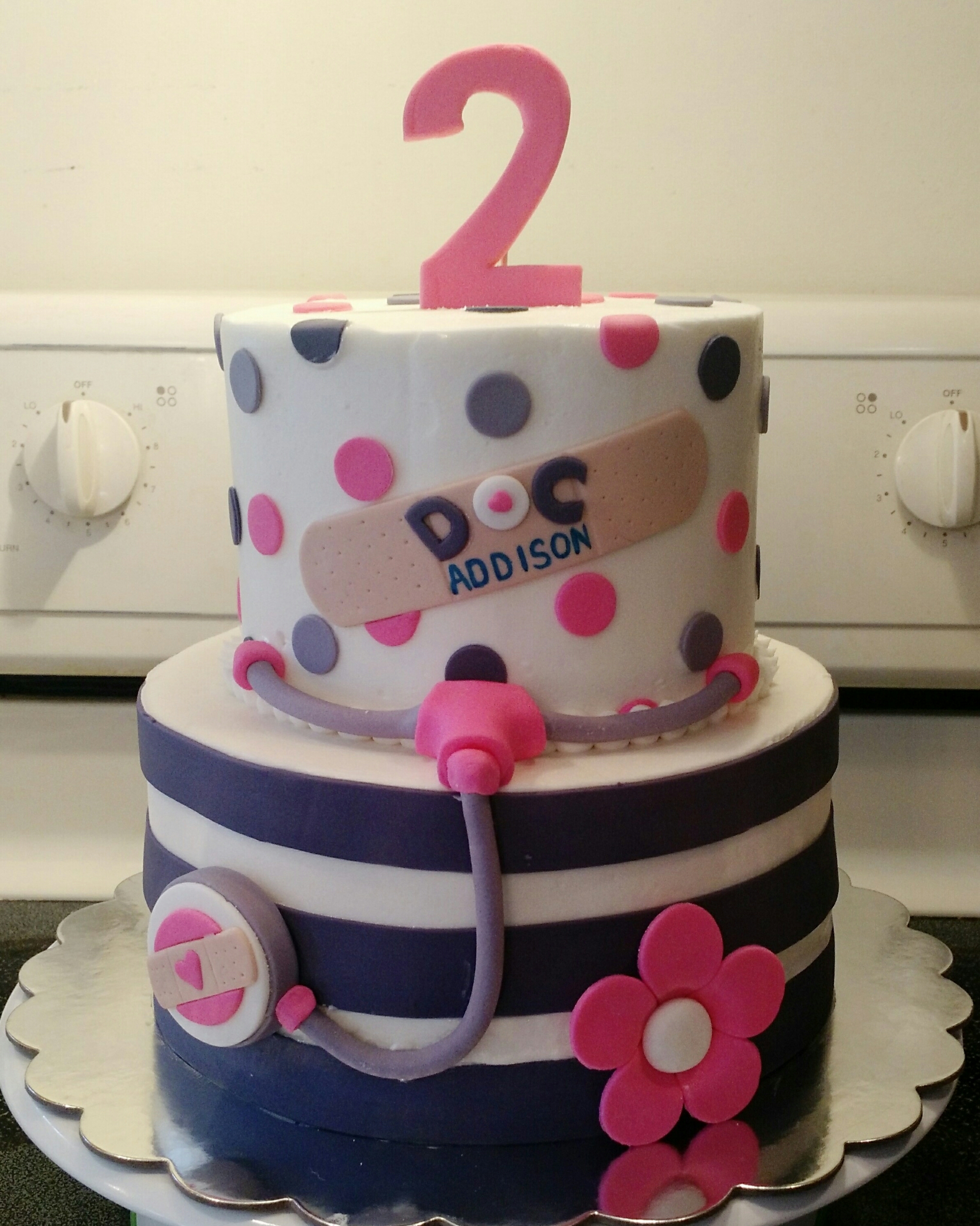 An 8″ vanilla cake with a sugar cookie middle, iced with vanilla buttercream. A 6″ chocolate cake with a chocolate chip cookie middle, filled with chocolate buttercream and iced with vanilla buttercream. All decorations are hand from fondant.