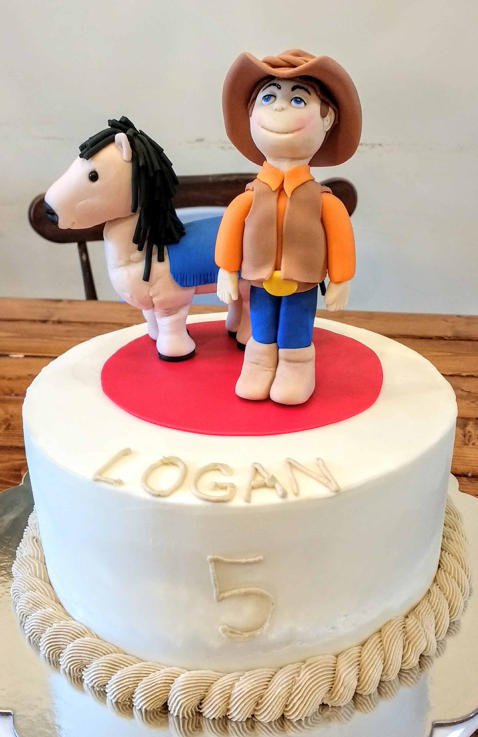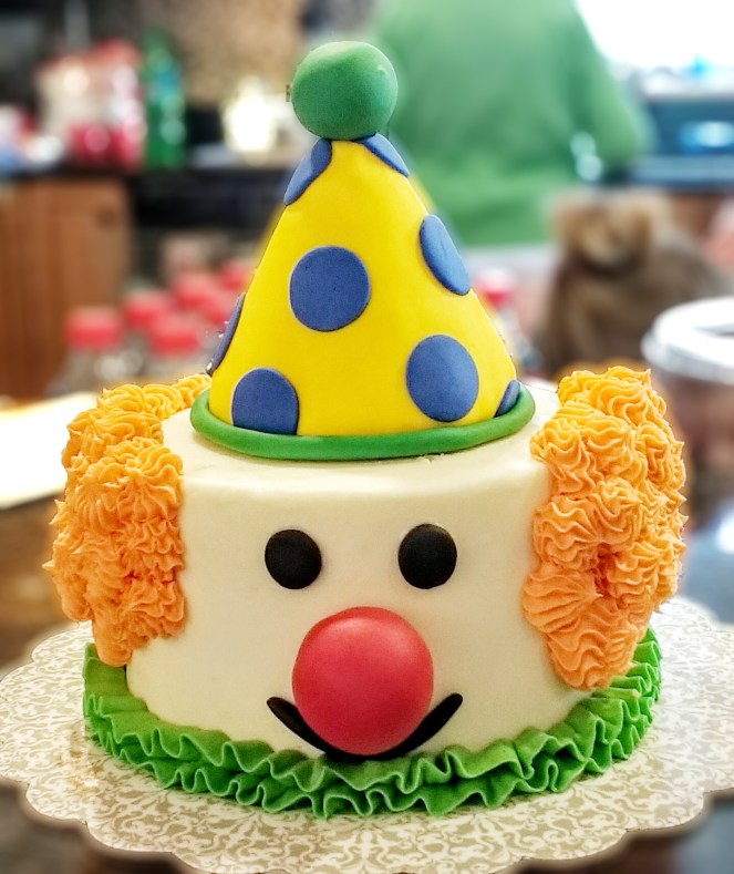 A 10″ strawberry cake and a 6″ vanilla cake, both iced with vanilla buttercream. All accents and decorations are handmade from fondant. A 6″ vanilla cake iced with vanilla buttercream for the clown smash cake.