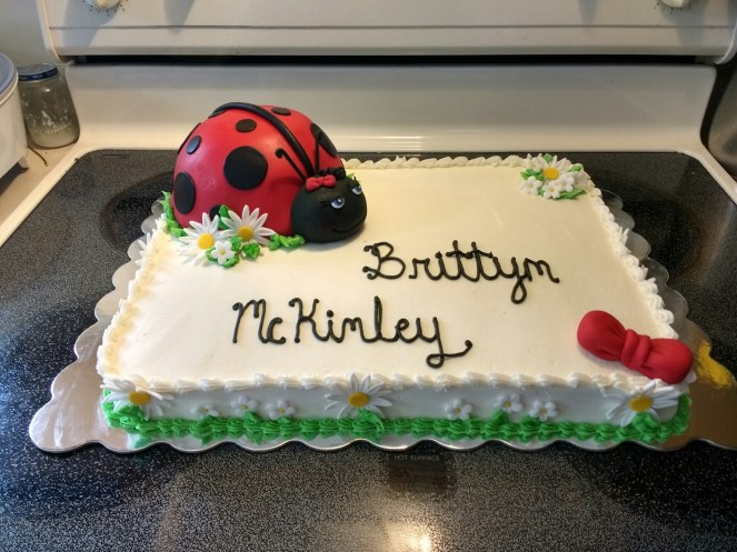 A half sheet cake, almond flavored, iced with almond flavored buttercream. The lady bug is cake as well that is covered in fondant. All decorations are hand made from fondant.