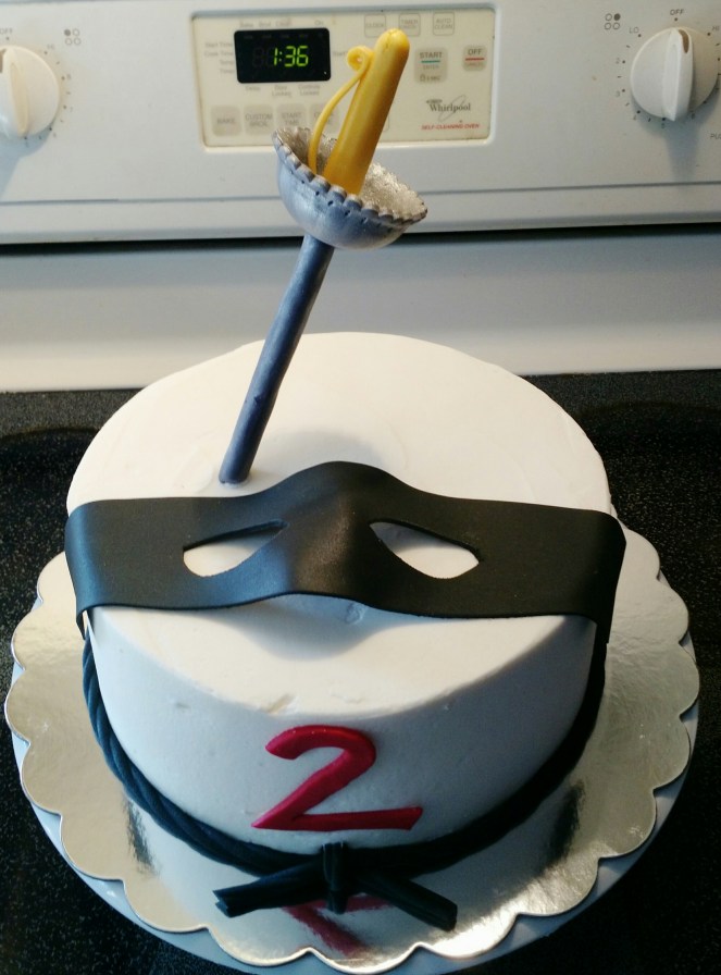 An 8″ vanilla cake iced with vanilla buttercream. All decorations are handmade from fondant. The 2 is taking the place of the Z