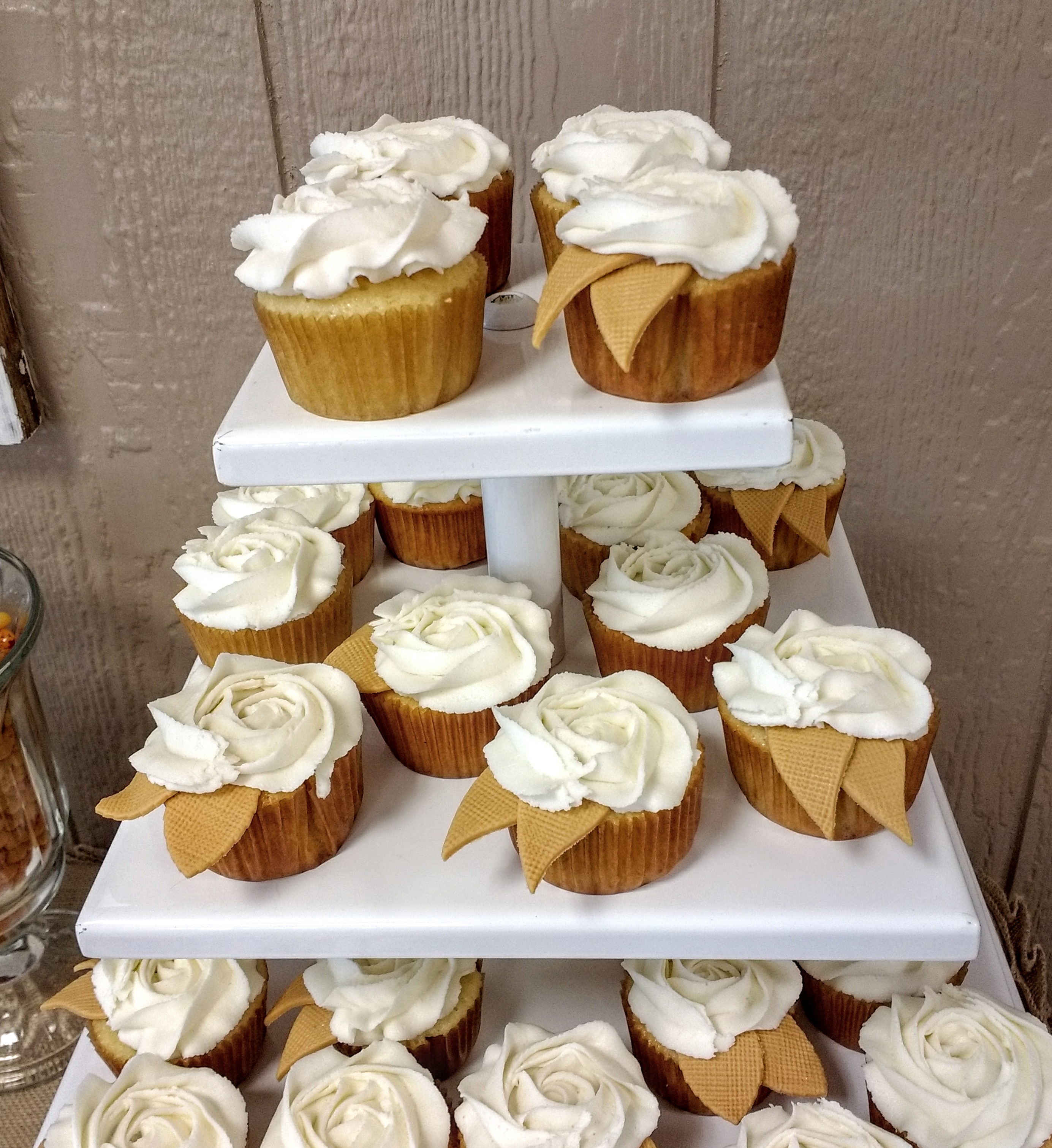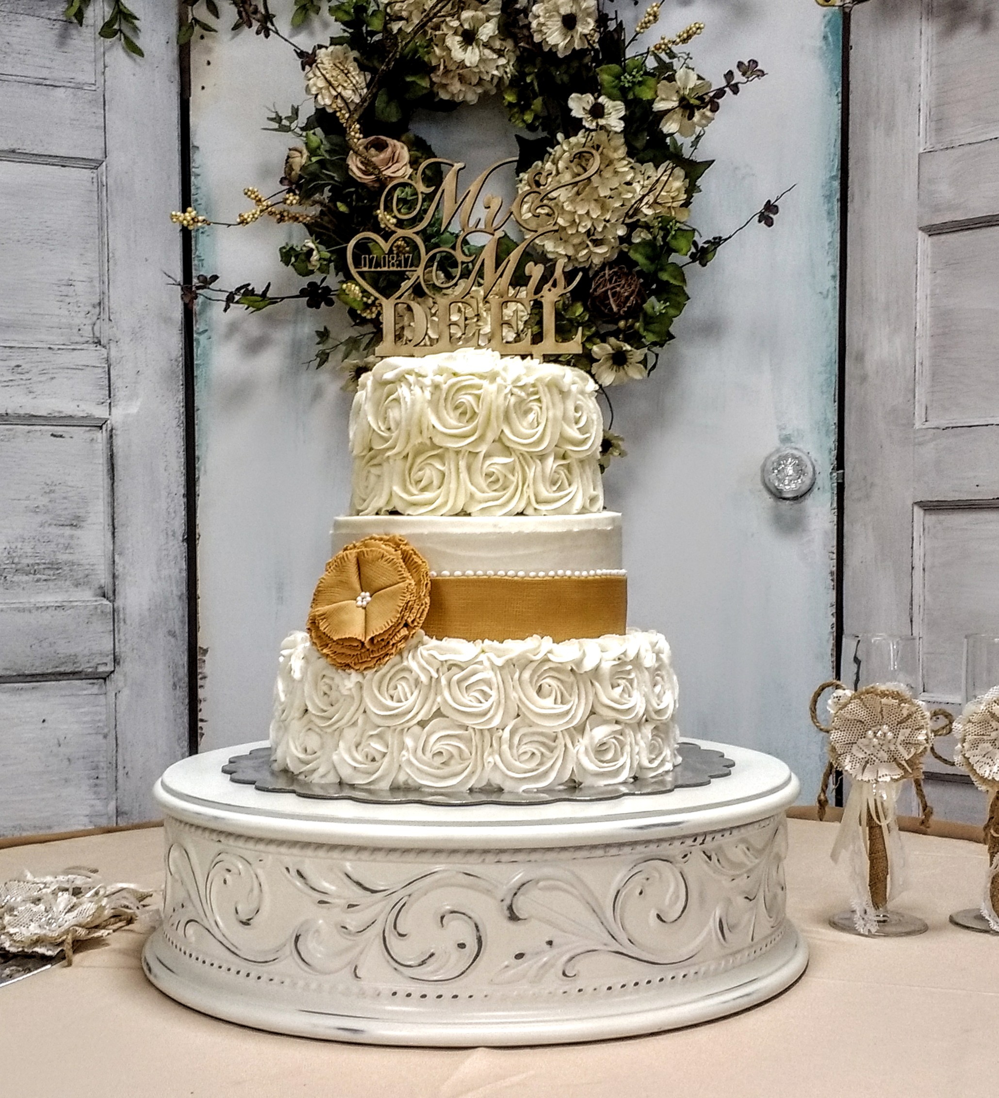 A 6″,8″, and 10″ vanilla cake iced with vanilla buttercream. The flower and burlap ribbon are handmade from fondant. Cupcakes were made to match.