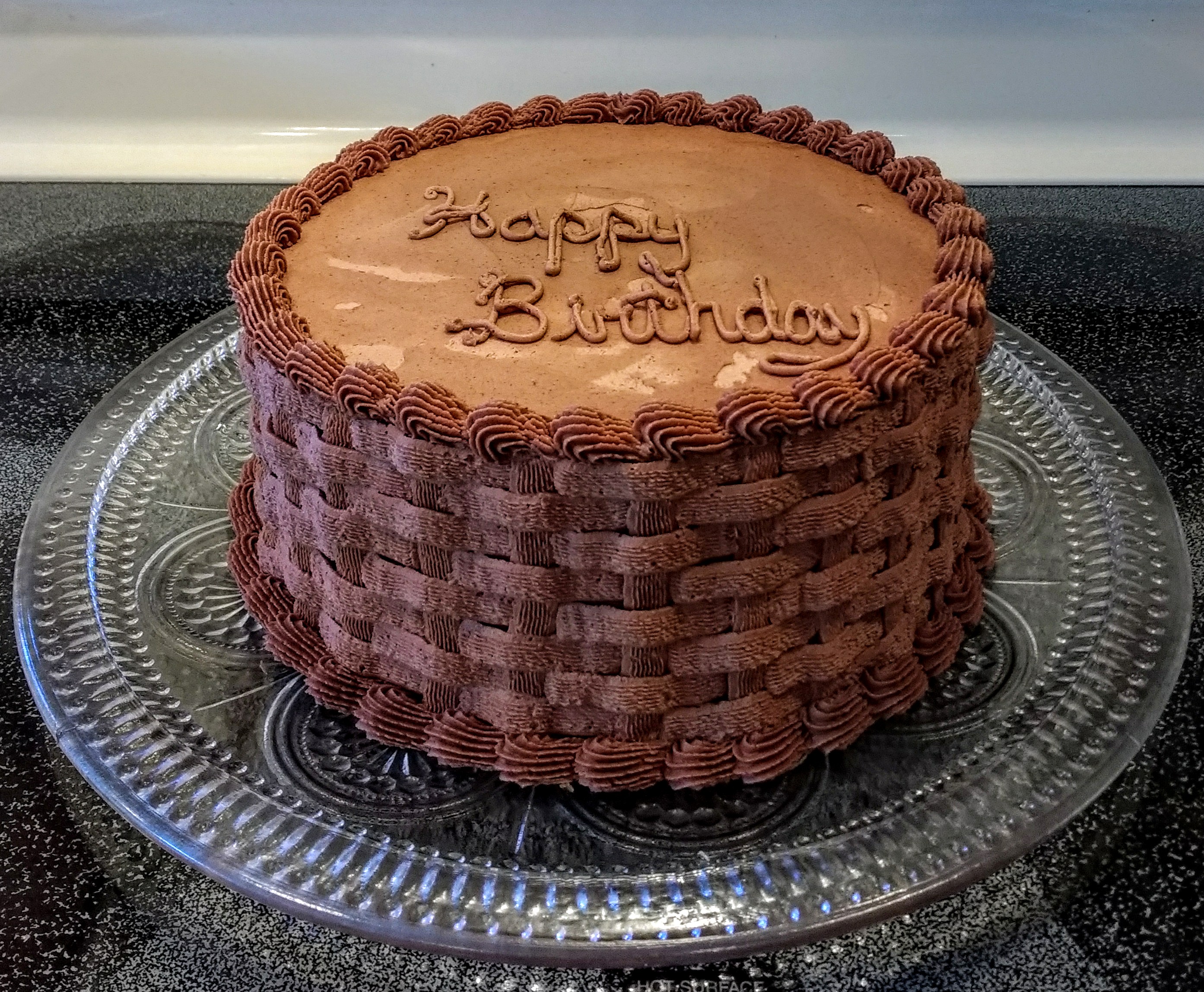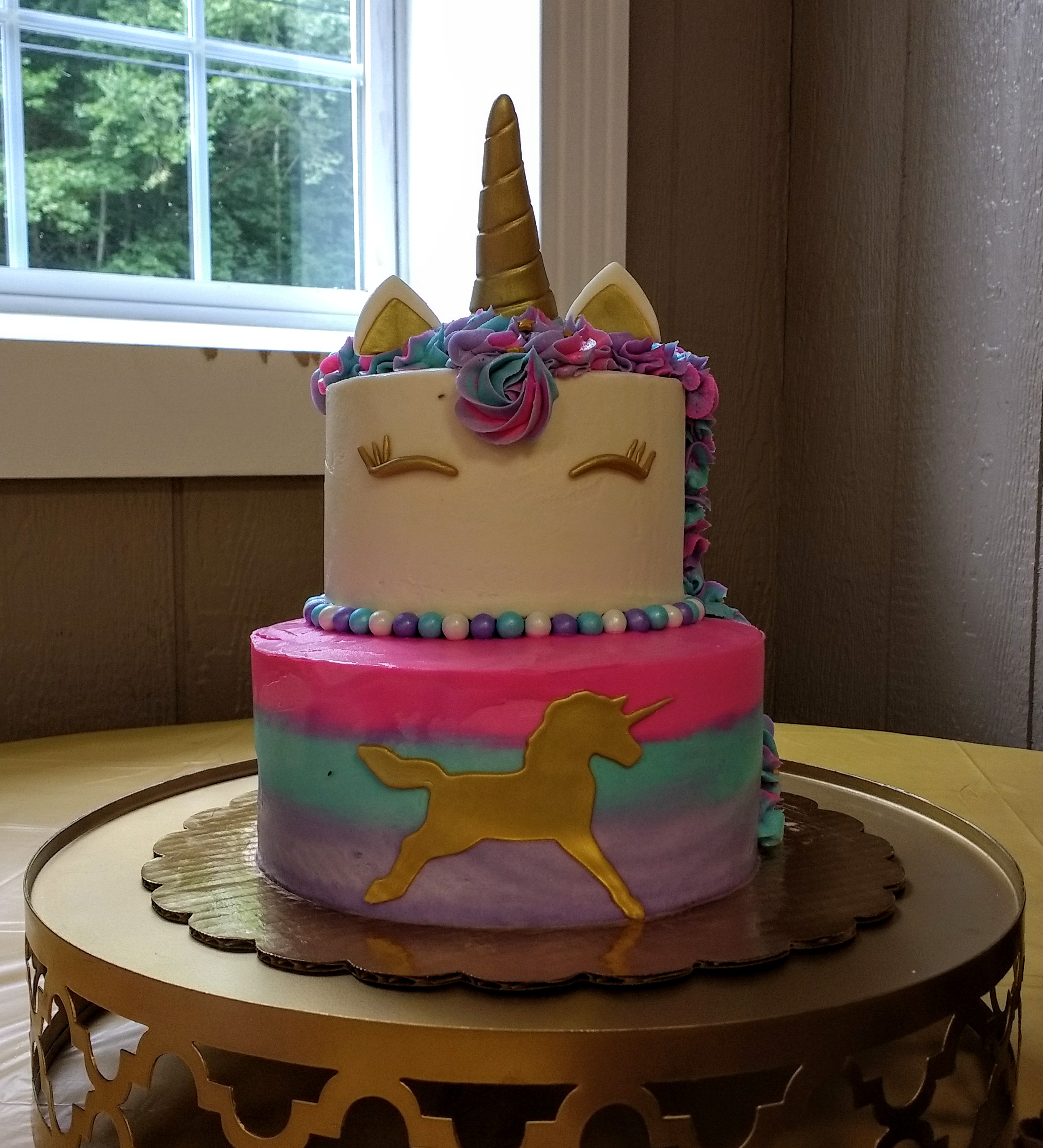 An 8″ pink/vanilla cake and a 6″ funfetti came over with vanilla buttercream. The horn, eyes, ears and unicorn are handmade from fondant.