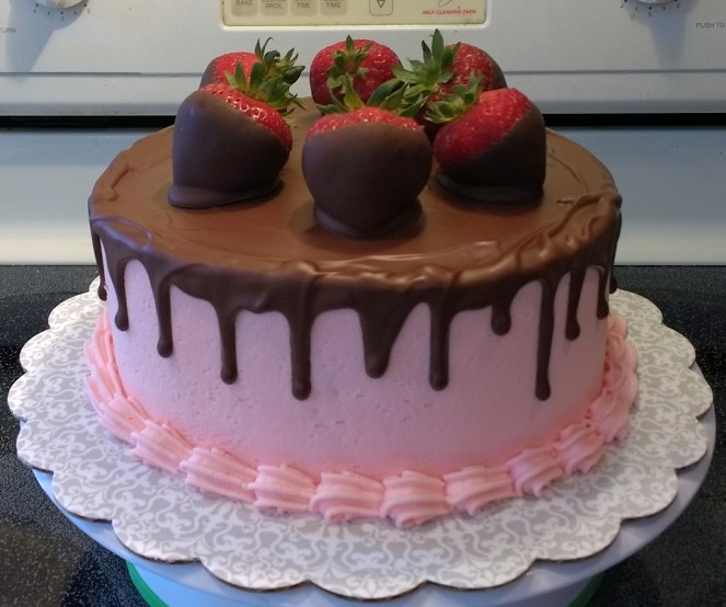 An 8″ strawberry cake with a creamy strawberry filling. Iced with strawberry buttercream and a milk chocolate drip. 6 chocolate covered strawberries sit on top!
