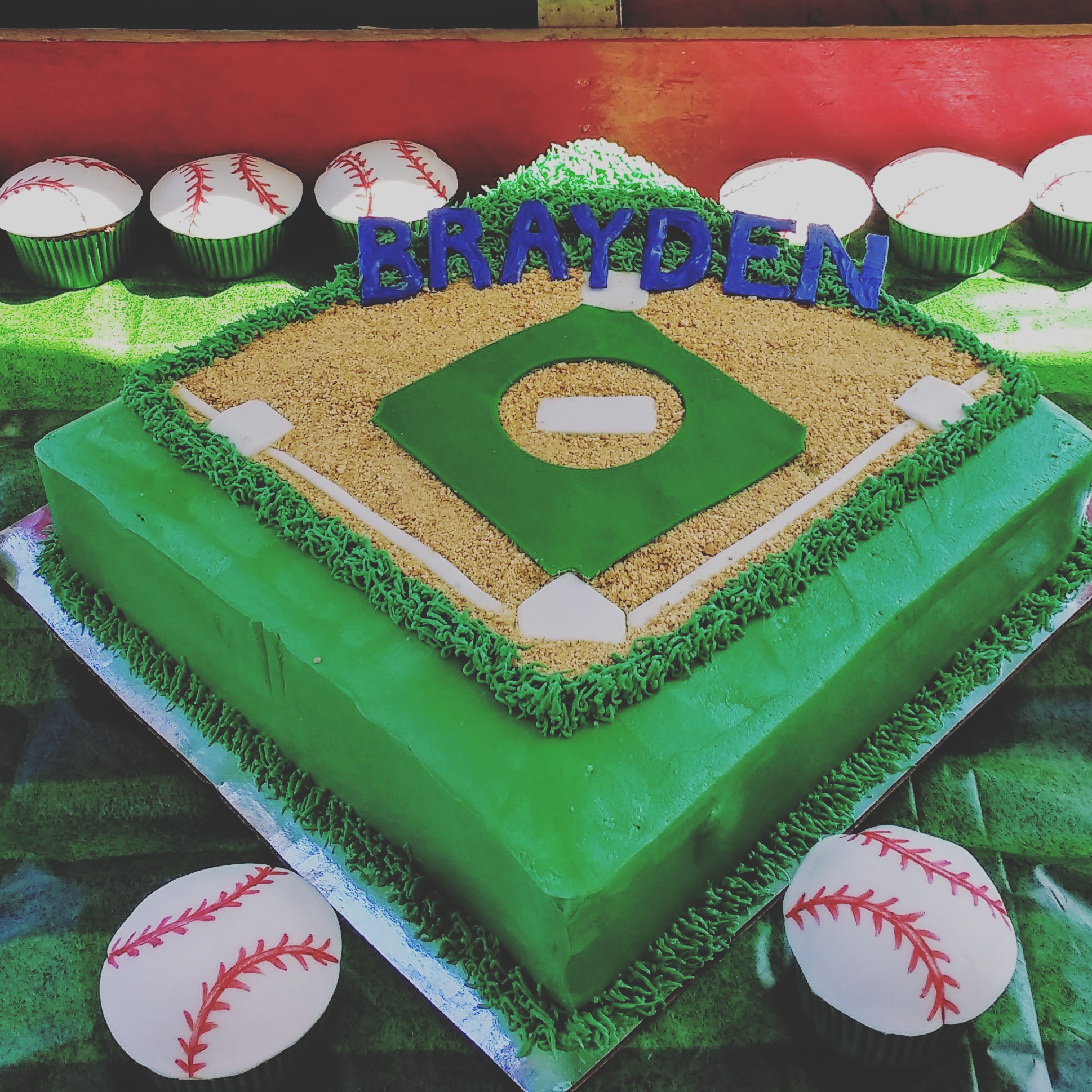 An 8″ chocolate cake and a 6″ vanilla cake iced with vanilla buttercream. The Mickey “heads” and ears are made out of chocolate. All other decorations are made from fondant. The smash cake is a 6″ chocolate cake iced with vanilla buttercream, a chocolate head and fondant decorations.