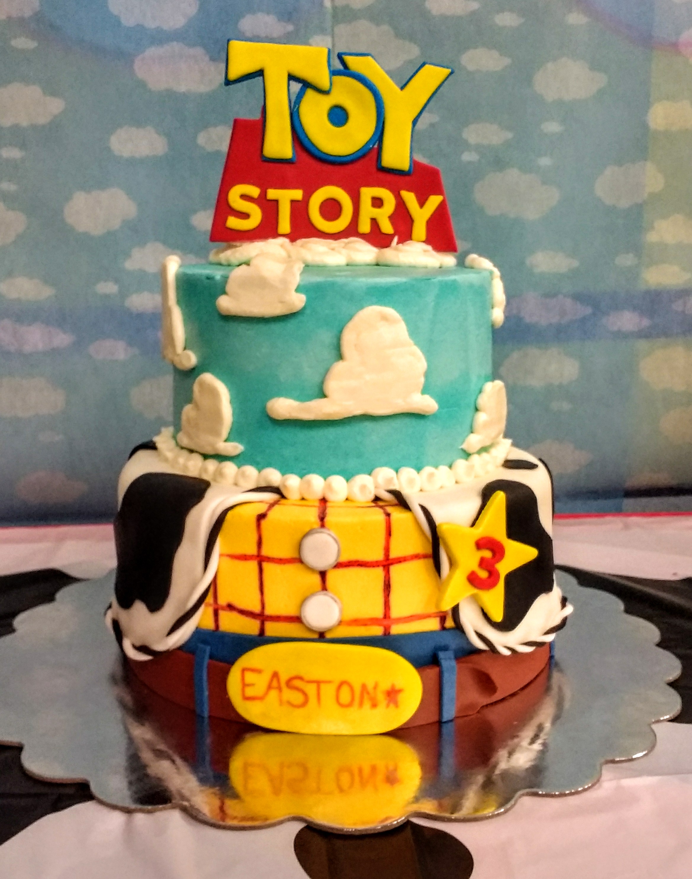 A Toy Story birthday! A 6″ and 8″ vanilla cake iced with vanilla buttercream. The logo, best, pants/belt, buckle, buttons and badge are all handmade from fondant. Also 24 chocolate cupcakes iced with vanilla buttercream topped with you soldiers.