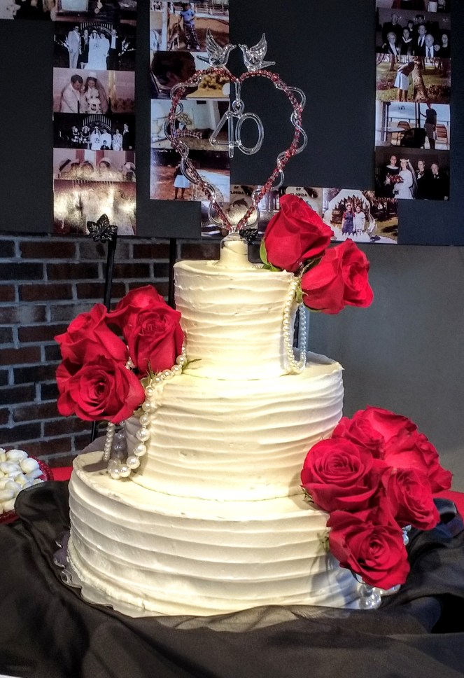 A 4″,8″ and 12″ vanilla cake iced with vanilla buttercream. The flowers and beads are real. 6 dozen vanilla cupcakes iced with vanilla buttercream. Roses on cupcakes are fondant.