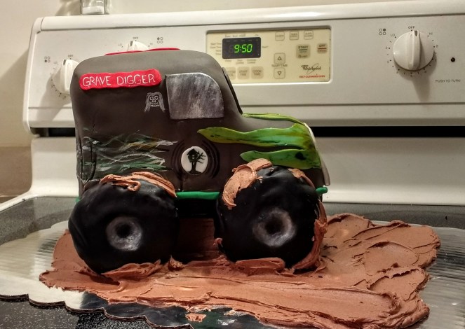 So, this was a grave digger cake in more than one way. It just about sent me to my grave (not really, just very frustrating). This is a sculpted “Grave Digger” monster truck cake that would feed 25, it’s to small. It needed to be bigger to look right. Next time (if ever) it will feed at least 35. I totally underestimated how much cake it would take. Live and learn I guess.