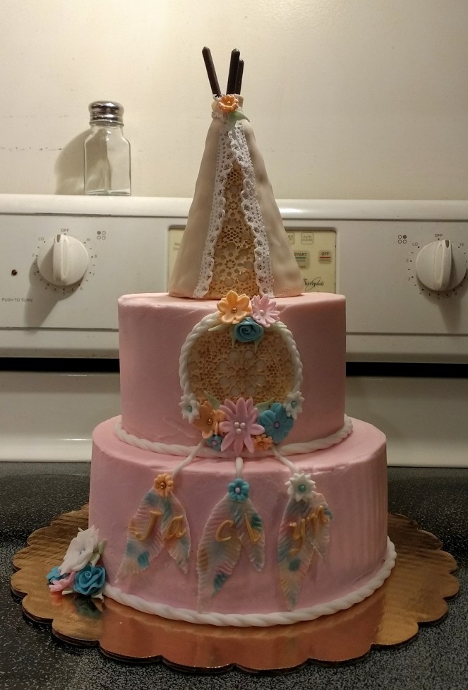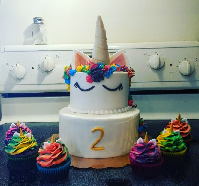 An 8″ and 6″ vanilla cake iced with vanilla buttercream. 24 chocolate cupcakes iced with vanilla buttercream. All ears, horns, eyes and 2 are handmade from fondant.
