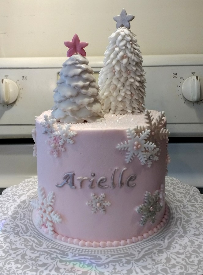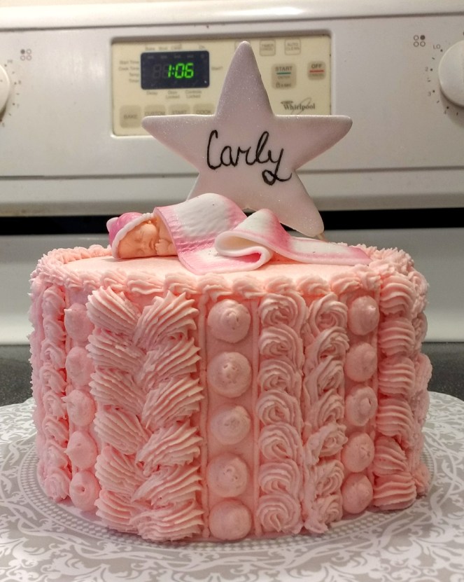I got a new niece two days ago so of course I had to make her a cake! 😉 A 6″ strawberry cake with strawberry icing. The baby, blanket and star are handmade from fondant. The cake is iced in a “cable knit sweater” pattern.