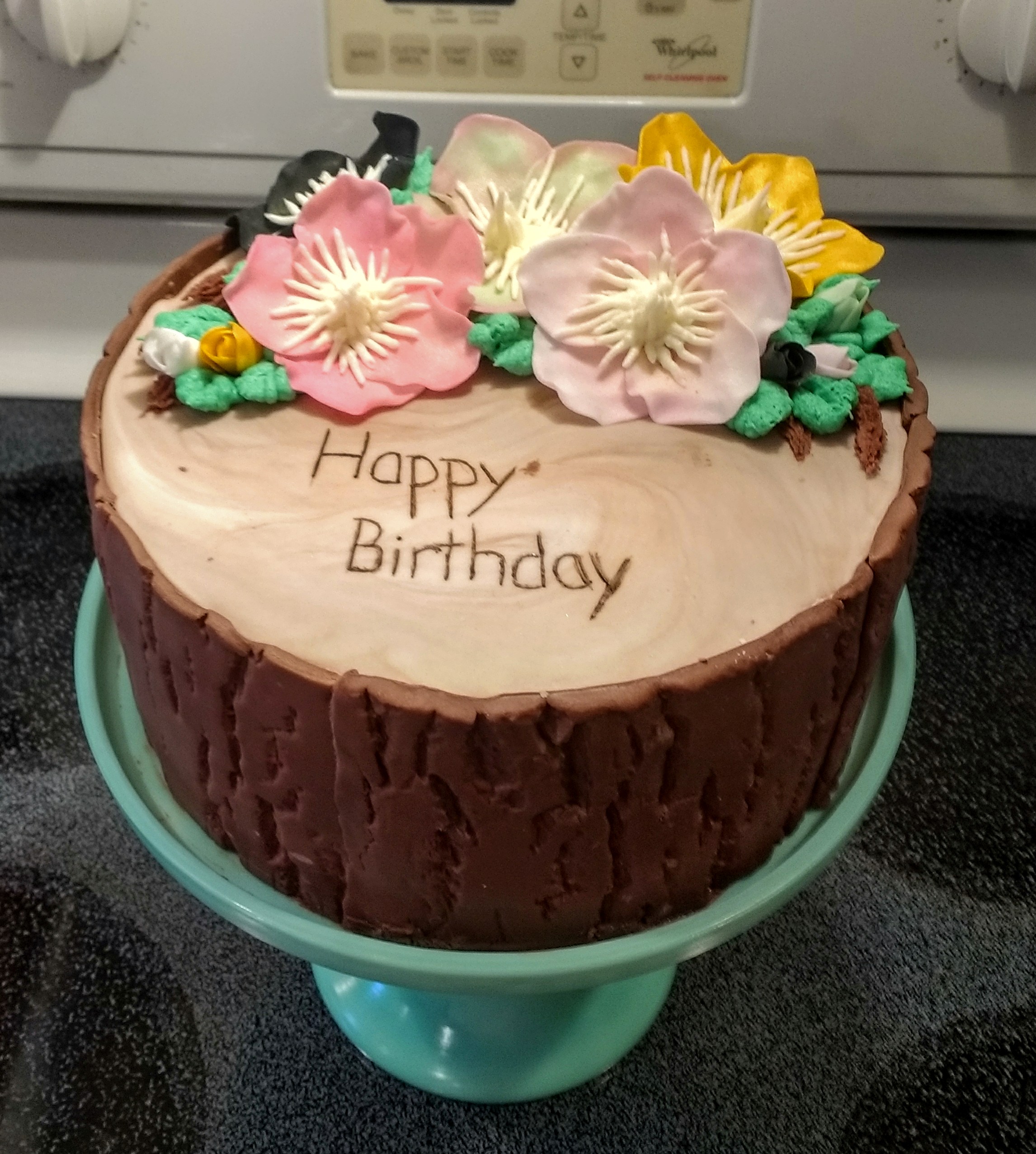 An 8″ chocolate cake iced with whipped chocolate ganache, covered with modeling chocolate bark and fondant hellebores.