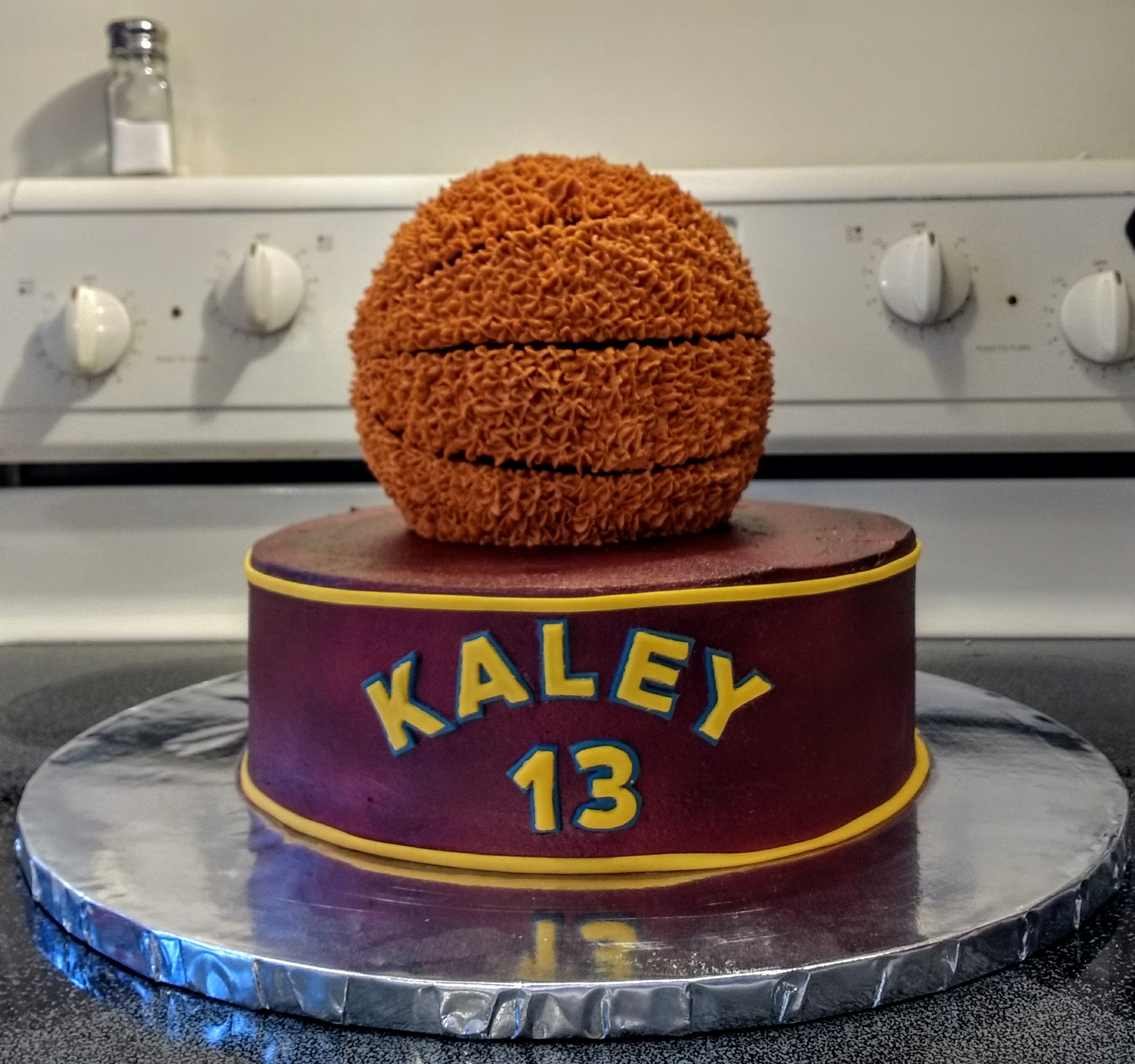 A Cleveland Cavaliers themed cake. A 10″ white cake and a chocolate “ball”cake, both are iced with vanilla buttercream. The name and number are made from fondant.