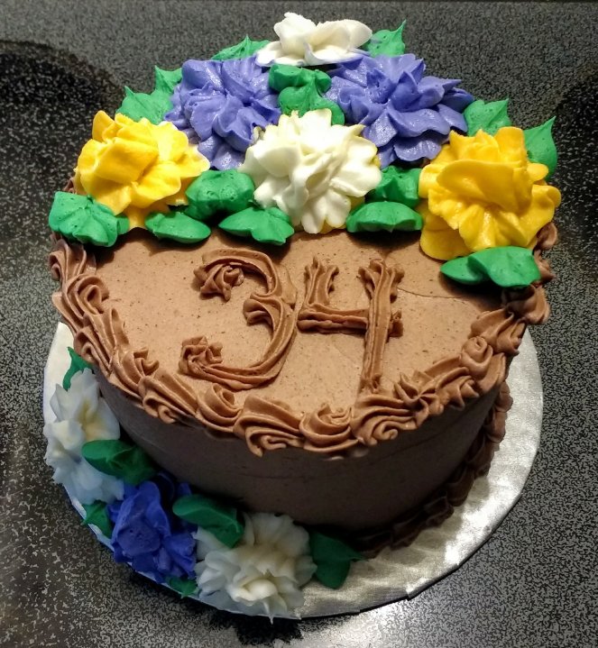 A 6″ peanut butter cake iced with chocolate buttercream. “Carnation” flowers are vanilla buttercream.